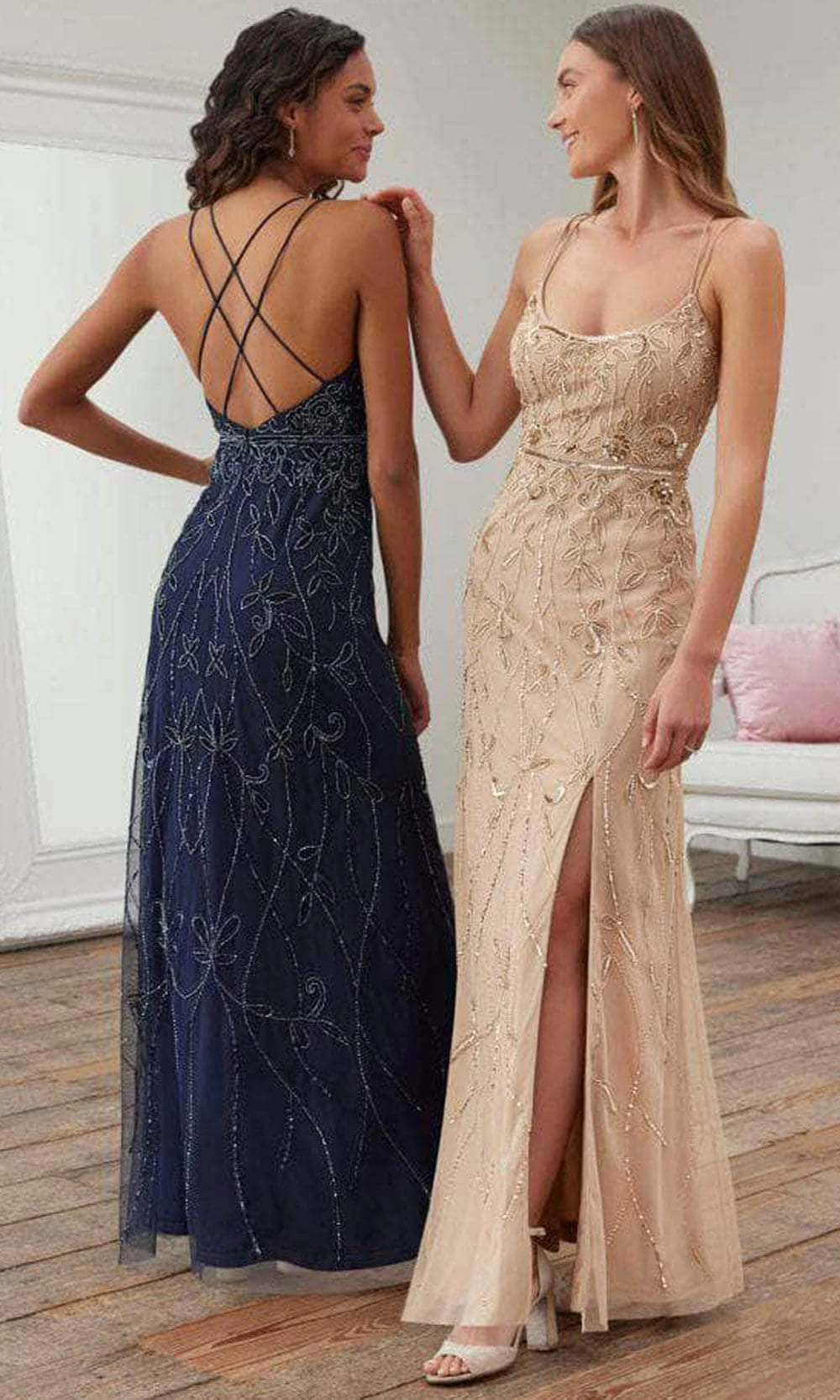 Take their breath away with this stunning evening dress by Adrianna Papell Platinum 40376. Accented with iridescent sequins and beads, this sleeveless fitted bodice shows a low-cut scoop neckline supported by dual spaghetti straps that continuously traverses to an open back creating a crisscross design. A cinched on the waist crowns the sheath skirt as it luminously ends in a full-length hem with a high slit. Exude utter beauty in this Adrianna Papell Platinum masterpiece. Models are wearing Navy and Champagne colors.