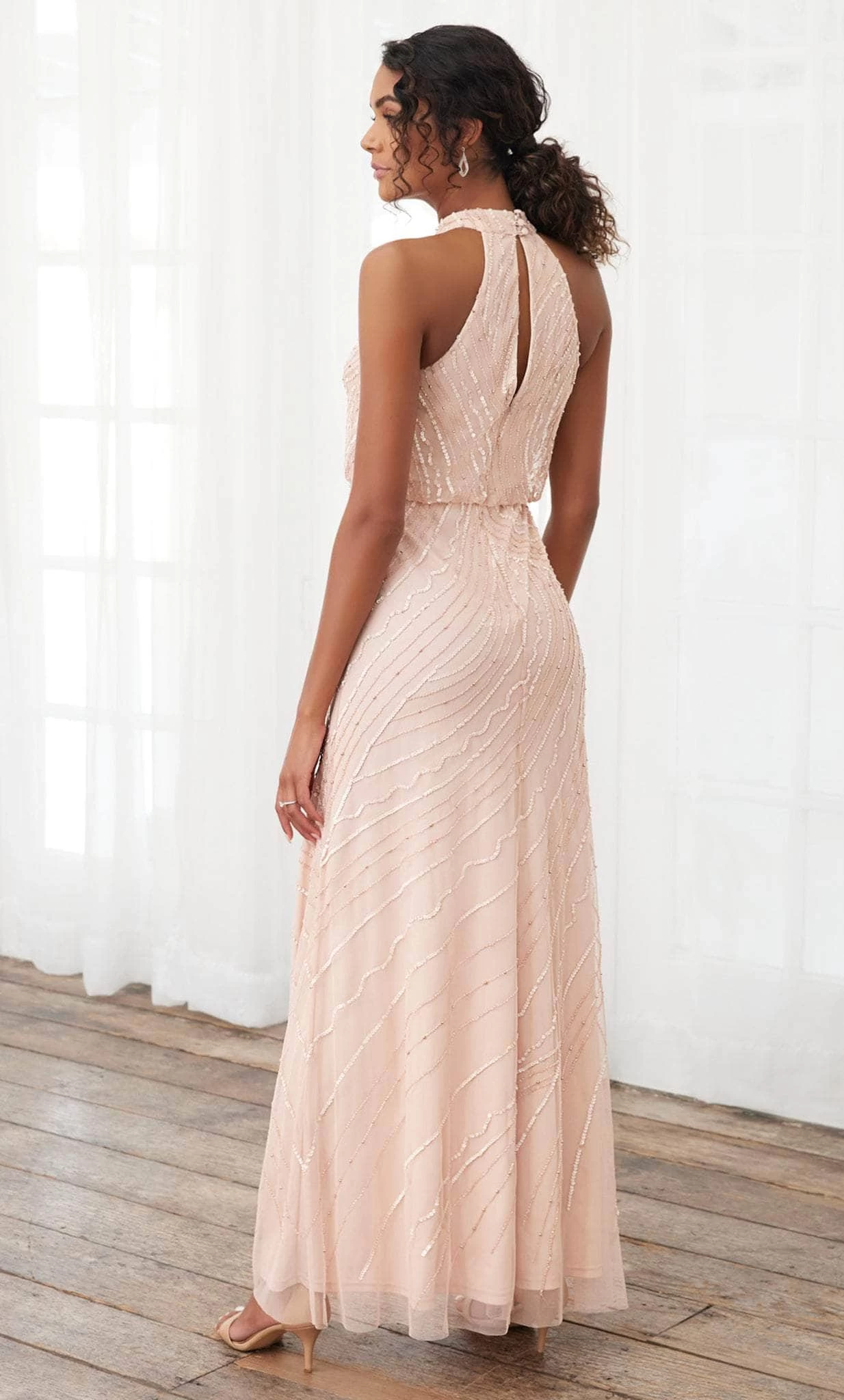 Go for a timeless and sophisticated look wearing this prominent House of Wu 40393. Opening with a classy halter neckline, this full length gown bares the shoulders for a fabulous night out. The bodice fits loosely, folding over a cinched waist. Meanwhile, the skirt falls in a sheath silhouette, cut with a daring high front slit. Exquisite beadwork adorns the ensemble, carving out curvy patters that highlihgt the figure. Show your sophisticated sense of style in this House of Wu 40393 creation. Models are wearing Blush and Rose Gold color.