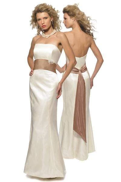 Look immaculately gorgeous in this stunning gown by Alexia Designs 2700. Tailored in elegant prima satin fabric, the dress allures in a strapless straight across neckline with princess seams that curve the fitted bodice. A contrasting wide satin band embraces the natural waist and forms a long tail at the back. The skirt is fitted through the hips and gently flares to full-length sheath silhouette finish. This Alexia Designs creation exudes timeless, effortless elegance. Model is wearing Diamond White/Cafe color.