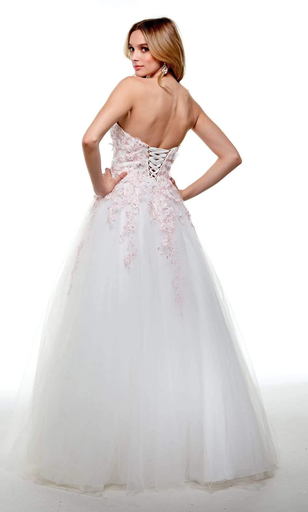 Appear like a modern princess in this enchanting Alyce Paris 6802 gown. This strapless tulle ballgown is embellished with 3d floral applique in a wonderful detailing. It features a sweetheart neckline over a fitted bodice and a corseted lace-up back. Make it your moment to shine in this beautiful gown from Alyce Paris. The dress is pictured in Diamond White/Black and Diamond White/Pink colors.