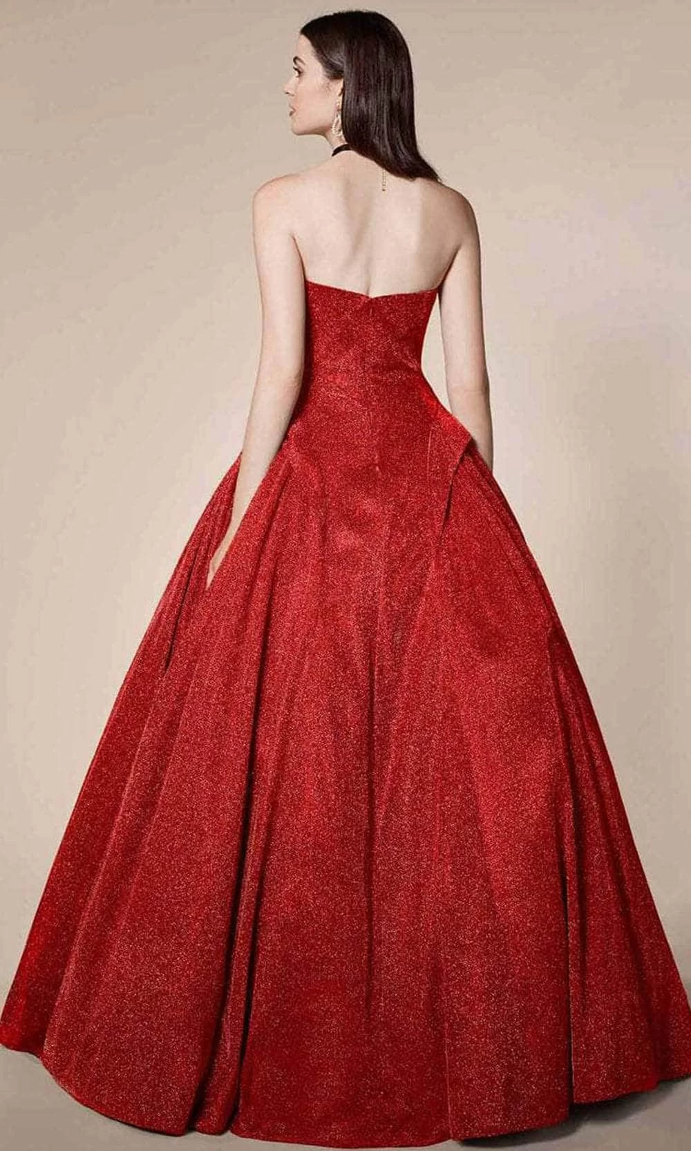 Radiate elegance and sophistication as you wearย this refined Andrea and Leo creation. In addition to its strapless fitting bodice with sweetheart neckline and straight mid-open back, this dress has an intrinsic glitter to it due to the metallic fabric used in its design. This gown, which features a voluptuous ballgown silhouette and side panel accents, is ideal for an evening gala, formal eventsย or a passionate ball dance. Leave a lasting impression in this Andrea and Leo masterpiece. Model is wearing Red color.