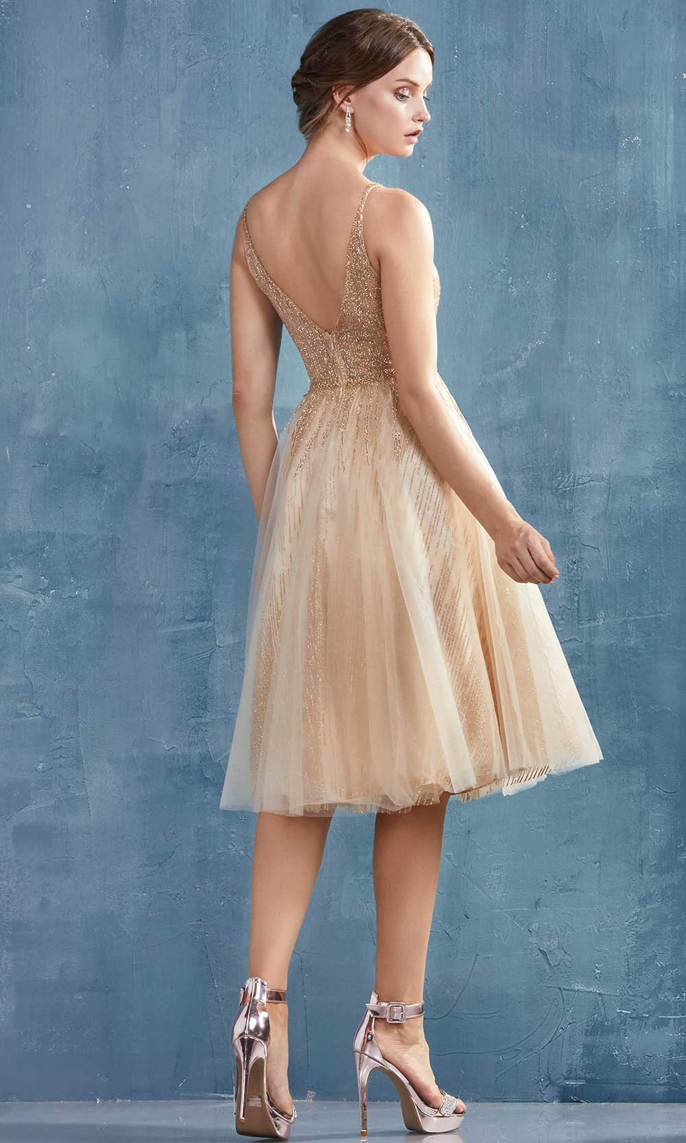 Get ready to show off your glamorous side in Andrea and Leo A0867. This tea length dress is intricately detailed with crystal beading. Designed in a sleeveless, deep V neckline with sheer inset at mid-bust. The fitted bodice shows a low V back and has a zipper closure. The skirt opens in a sassy, A-line silhouette. Leave everyone speechless when you enter the room in this Andrea and Leo look.