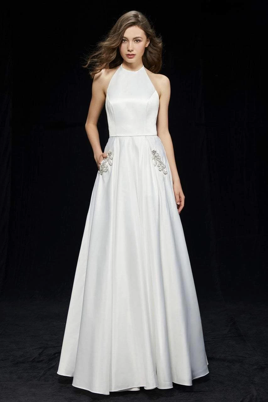 The solid bodice features a high halter neckline, princess seams, and an open back. The bodice is fitted with a nipped waist. The skirt is full with embroidery on the slant pockets and an A-line silhouette. This dress finishes with a full length hem.