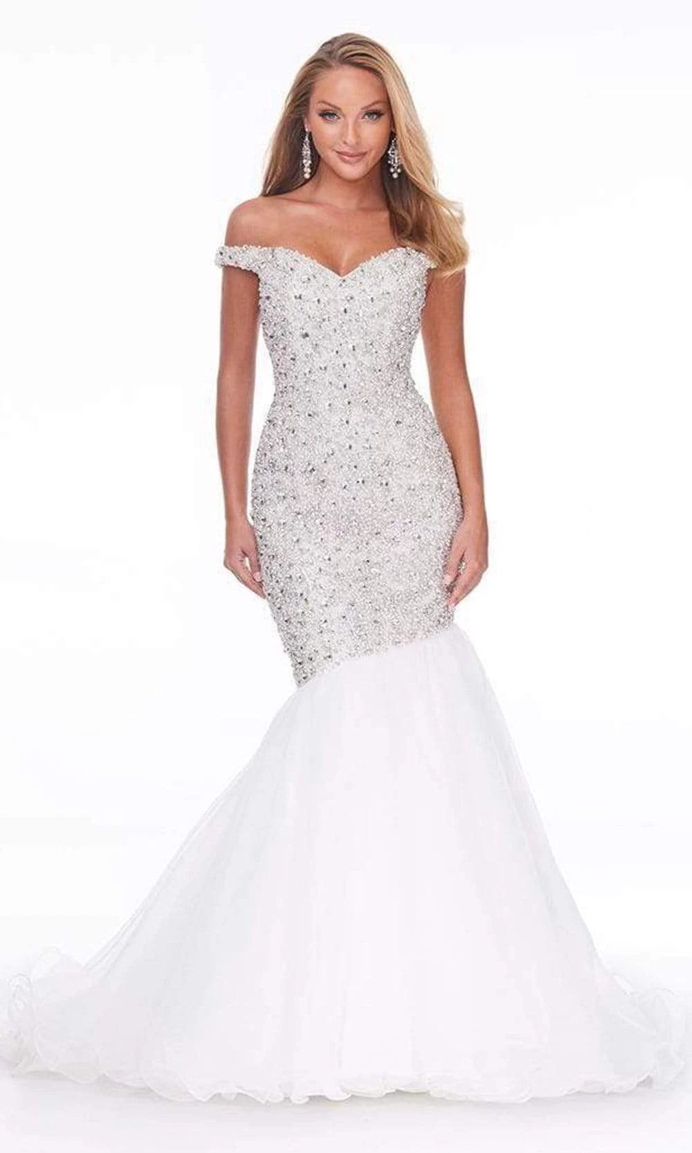 Have all eyes on you as you show up in this glamorous Ashley Lauren 11042 evening gown. This lovely off shoulder gown showcases a sweetheart neckline and mid-open back. The neckline and fitted skirt is fully encrusted in crystals and pearls as it leads to the fitted skirt with an asymmetrical organza wire hem and a sweep train. Heighten your charming appeal in this Ashley Lauren creation.