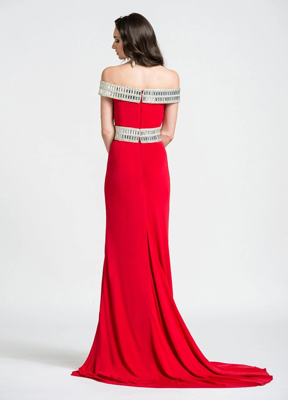 Sophisticated and statuesque, this sumptuous Ashley Lauren 1055 style matches your elegant persona. This jersey evening dress features a fitted bodice topped with an off shoulder neckline and straps covered in crystals that wrap across the waist. A floor-length skirt finishes this breath-taking creation with a glamorous sweep train for a dramatic appeal. This Ashley Lauren style will make sure you turn heads all night long.