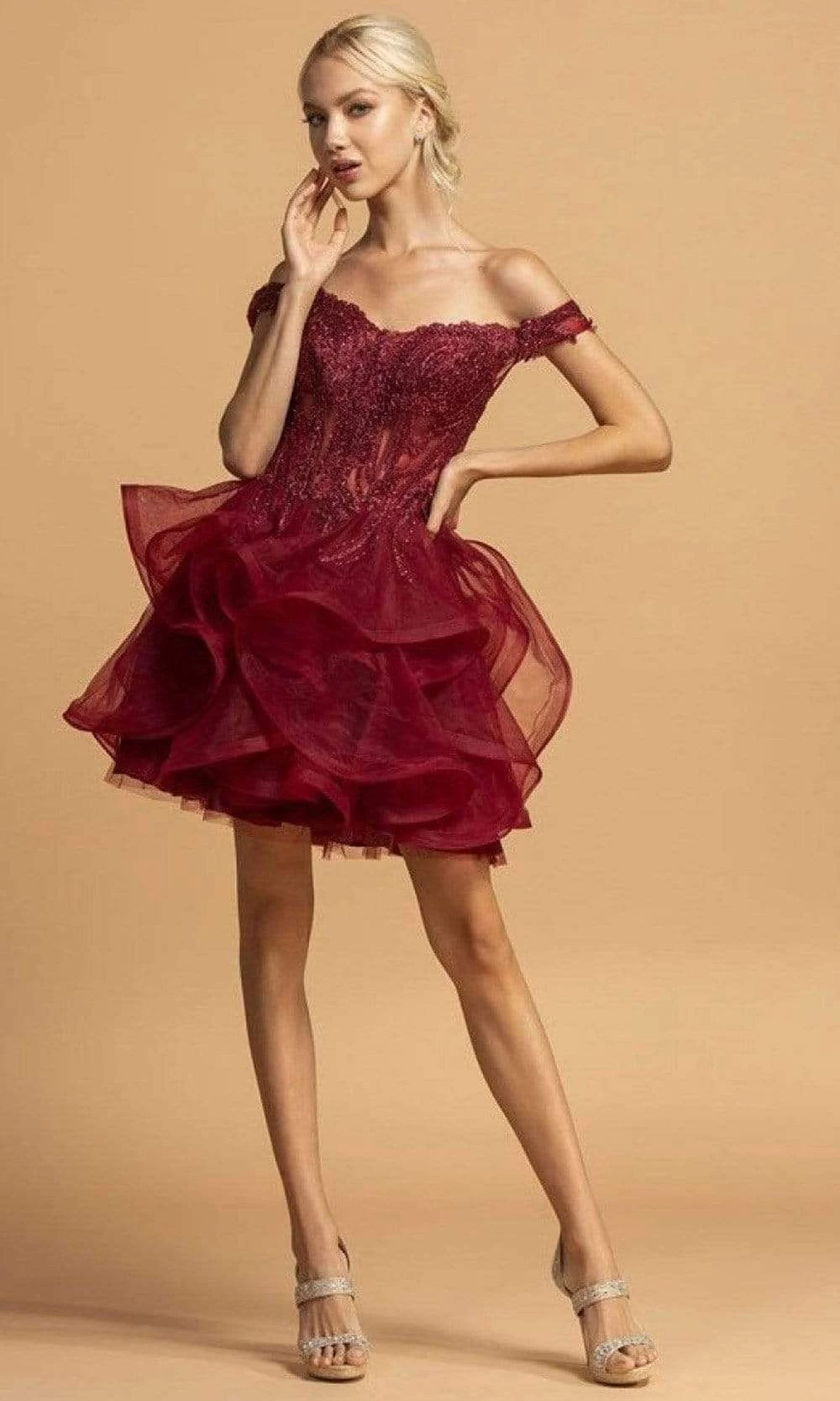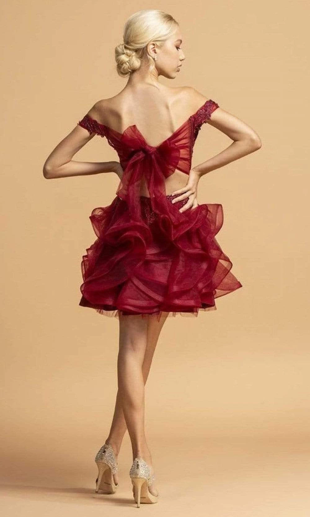 Show off your bubbly and pleasant personality with this dress by Aspeed Design S2094. This sassy and creative short dress in A-line silhouette is embellished and beaded on its corset bodice. It features sweetheart neckline and off shoulder sleeves while using organza fabric allover. It features bow back and sexy cut out. Aspeed Design will let you shine like the star that you are.