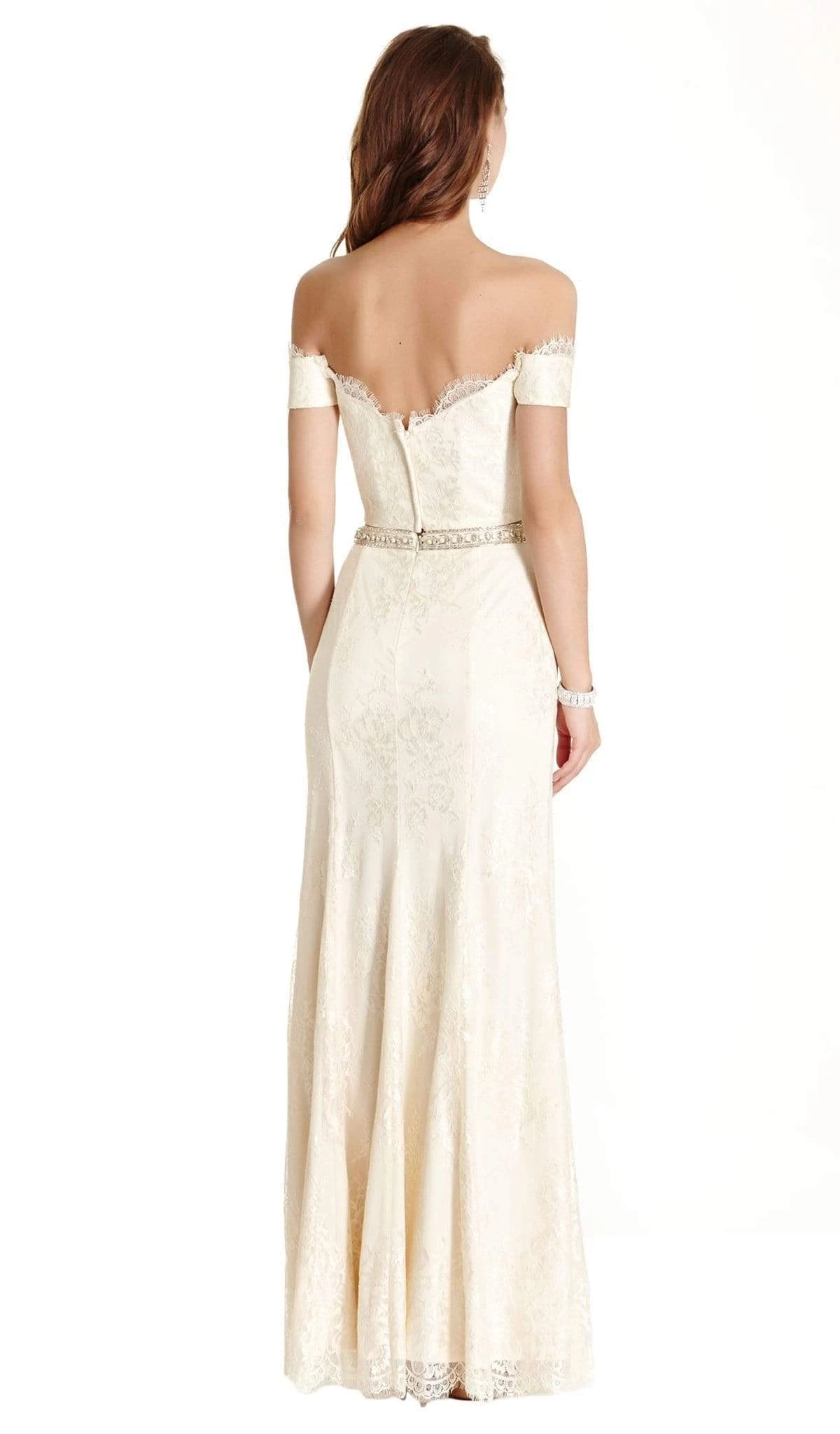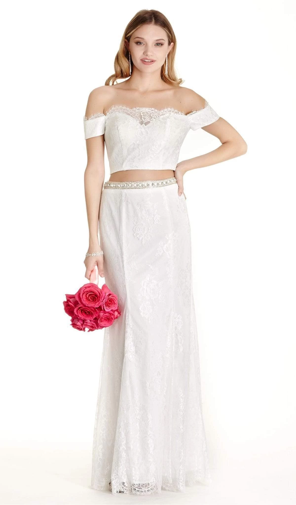 Look lovely in a timeless two piece from Aspeed L1759. Flaunts a scalloped off-shoulder neckline with sleeves and lace appliques. From the embellished waist forms a full length fitted skirt with a scalloped hemline. Be a vamp in an alluring dress from Aspeed.