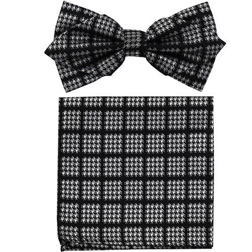 Black/White Houndstooth Bow Tie With Pocket Square (Pointed Tip)