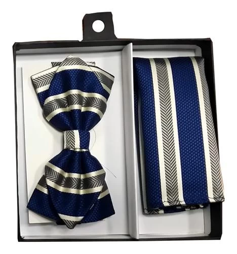 Easily accentuate your style with this blue and gray striped bow tie and matching pocket square. Made out of polyester, this pointed tip woven bow tie features textured blue, gray, and white stripes. This bow tie and pocket square set comes packaged in a nice box, so it makes a great gift for men!