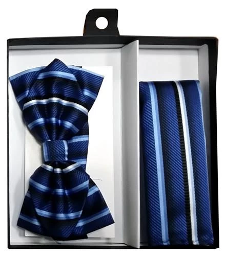 Add a classic item in your wardrobe with this blue striped bow tie and matching pocket square. Made out of polyester, this pointed tip woven bow tie features a nice combination of dark blue and white stripes. This bow tie and pocket square set comes packaged in a nice box, so it makes a great gift for men!