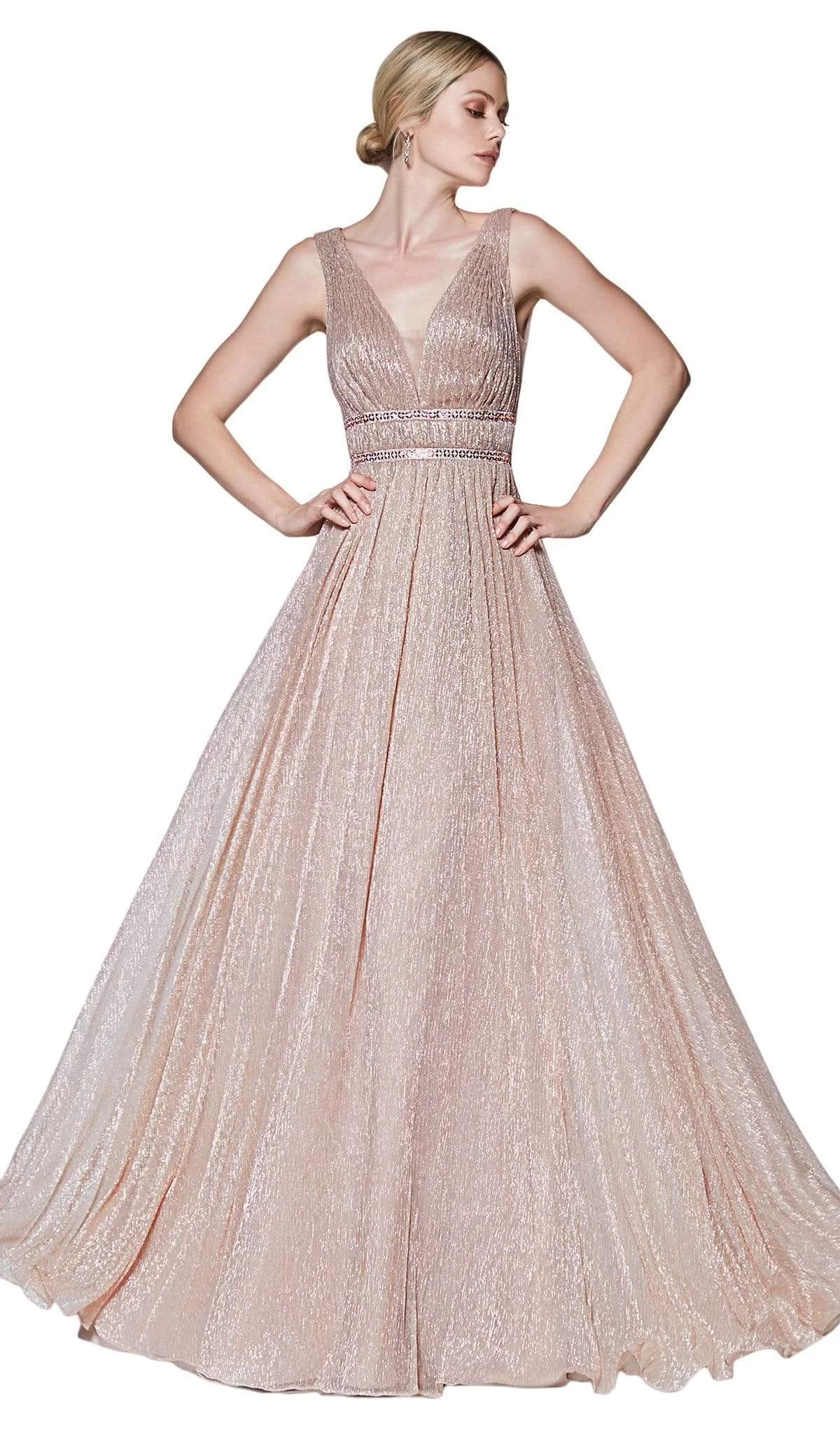 Capture the glamour as you walk on this stunning gorgeous evening gown by Cinderella Divine CJ524. A plunging V neckline with sheer inset detail at the bust bisects the sleeveless bodice with side panels and beaded dual empire belt. Fabulous pleats cascade the a-line skirt as it tapers to full length as the back flaunts an open V cut. Get ready to be captured in a picture of sophistication in this Cinderella Divine ensemble.