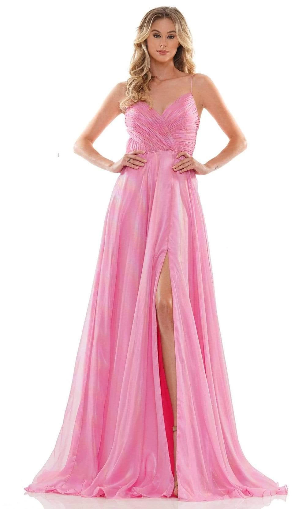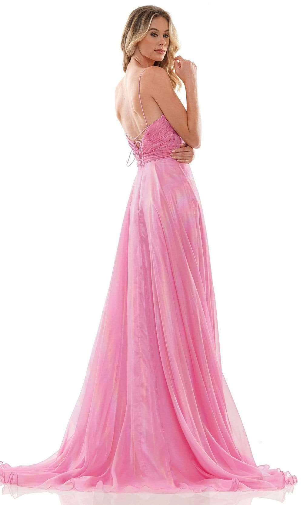You are more than gorgeous when you wear this unbeatable design from Colors Dress 2765. Beautifully crafted in a rainbow chiffon fabric, this glamorous dress shows a sleeveless, V neckline and spaghetti strap on a cross-ruched bodice. Spaghetti straps lend support to the fitted bodice as it crisscross and ties from the open back. The skirt flares an A-line silhouette that runs in full length hem and accented with a side slit, completed with sweep train. Create magical moments as you revel in Colors Dress creation. Model is wearing Pink/Multi color.