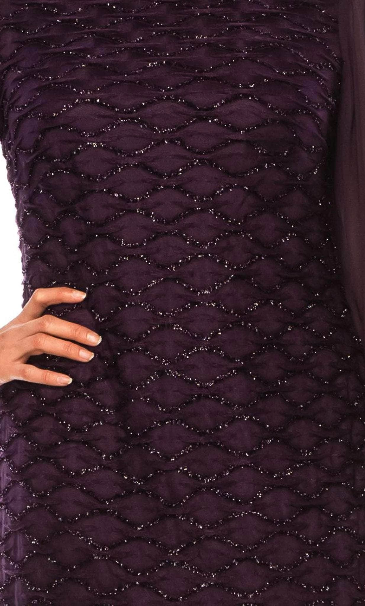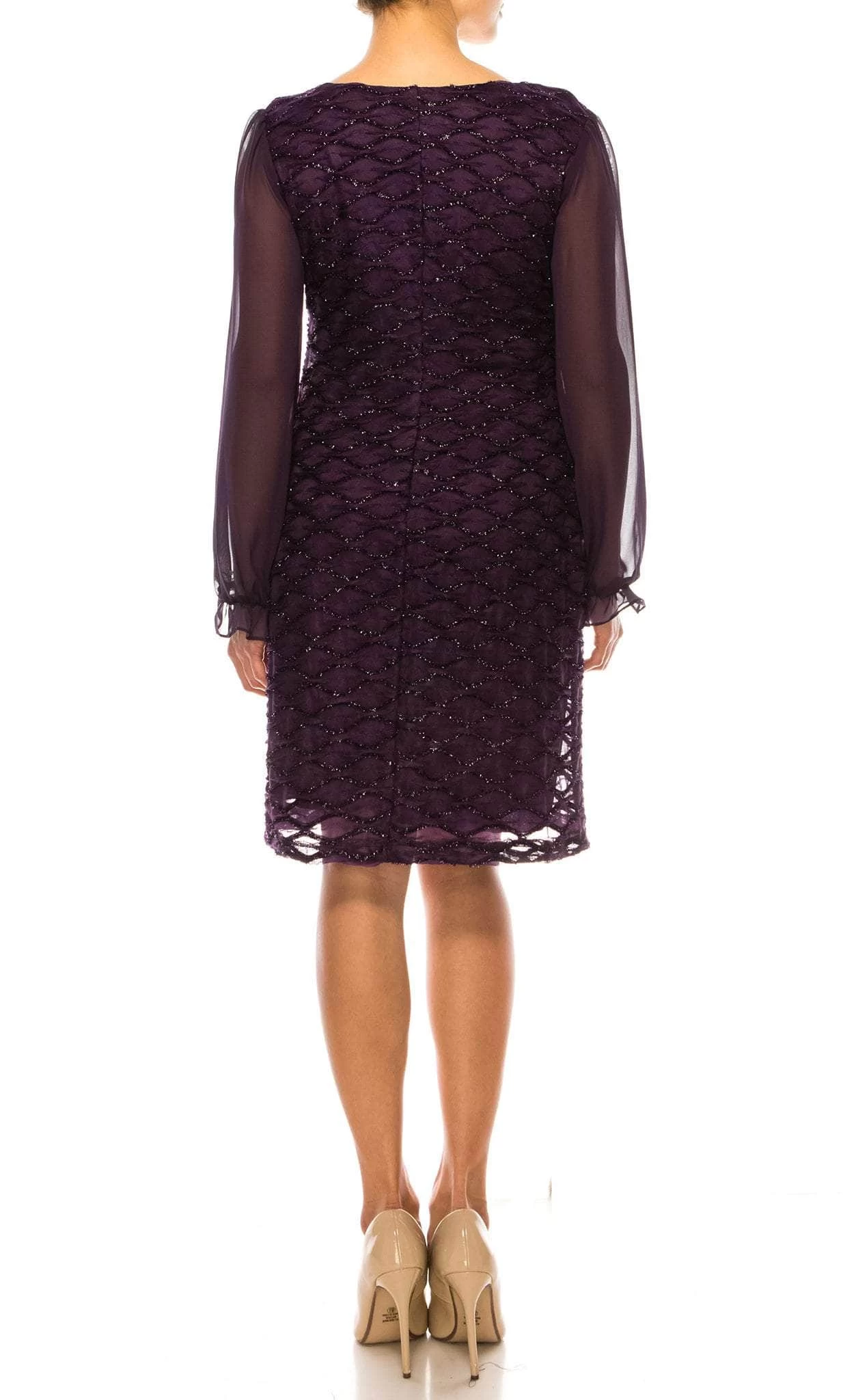 Get a glamorous look with this Connected Apparel TKH47900 short dress. This dress is made of a combination of mesh and chiffon, featuring a beautiful scale pattern adorned with intricate beading. The dress has long sleeves, providing coverage while still allowing for a touch of elegance. The back of the dress is enclosed for a sleek and polished look. The dress falls at a short length and has a flattering scoop neckline, accentuating the natural curves of the body. Promote attention-grabbing style in this stunning Connected Apparel TKH47900! Model is wearing Aubergine color.