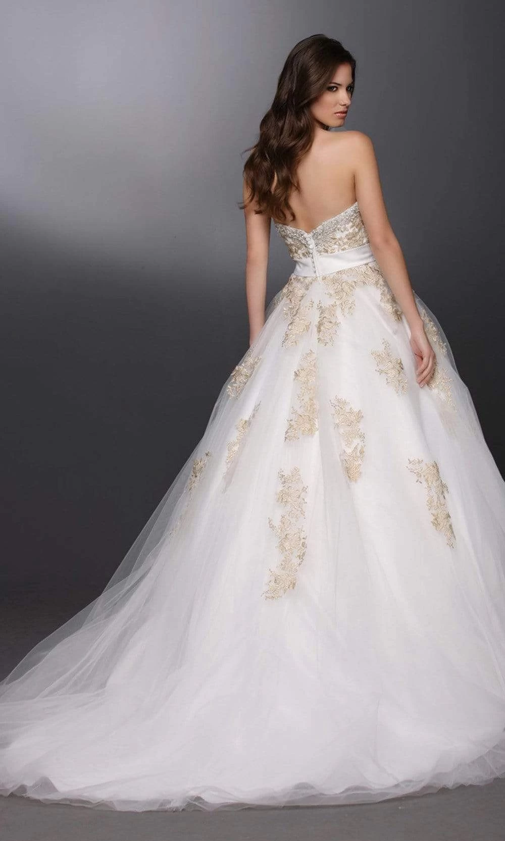| Details: | Strapless, Fitted bodice, Ballgown skirt, Covered buttons, Beaded belt, Chapel train, Open back, Back Zipper |