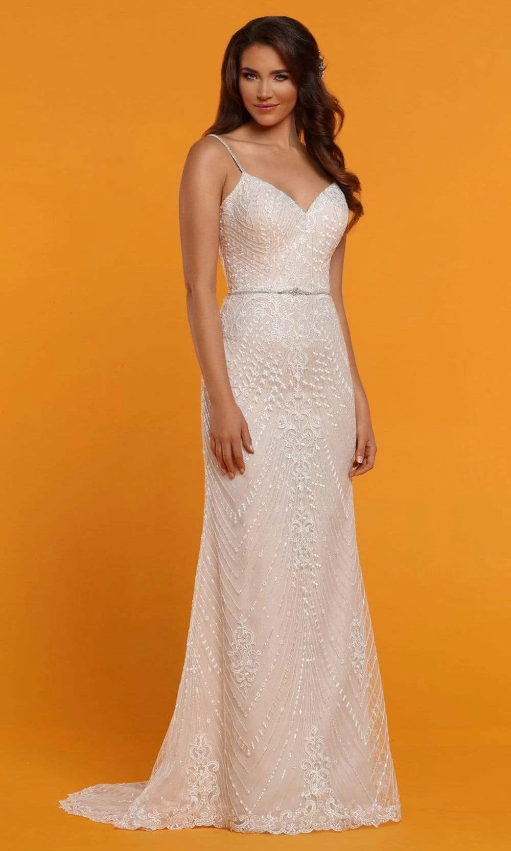 Bring on that look of an elegant Bride in this in this embellished Wedding dress by Da Vinci Bridal 50511. Luxurious tulle bridal dress lavishly festooned with sparkling beadworks throughout its whole silhouette, showcasing a V neckline coupled with a mid-open back while being held by sparkly spaghetti straps. Rhinestone band marks the natural waistline leading to the full-length column skirt that finishes with a subtle chapel style train. Display your sophisticated sense of style in this Da Vinci Bridal Bridal creation.