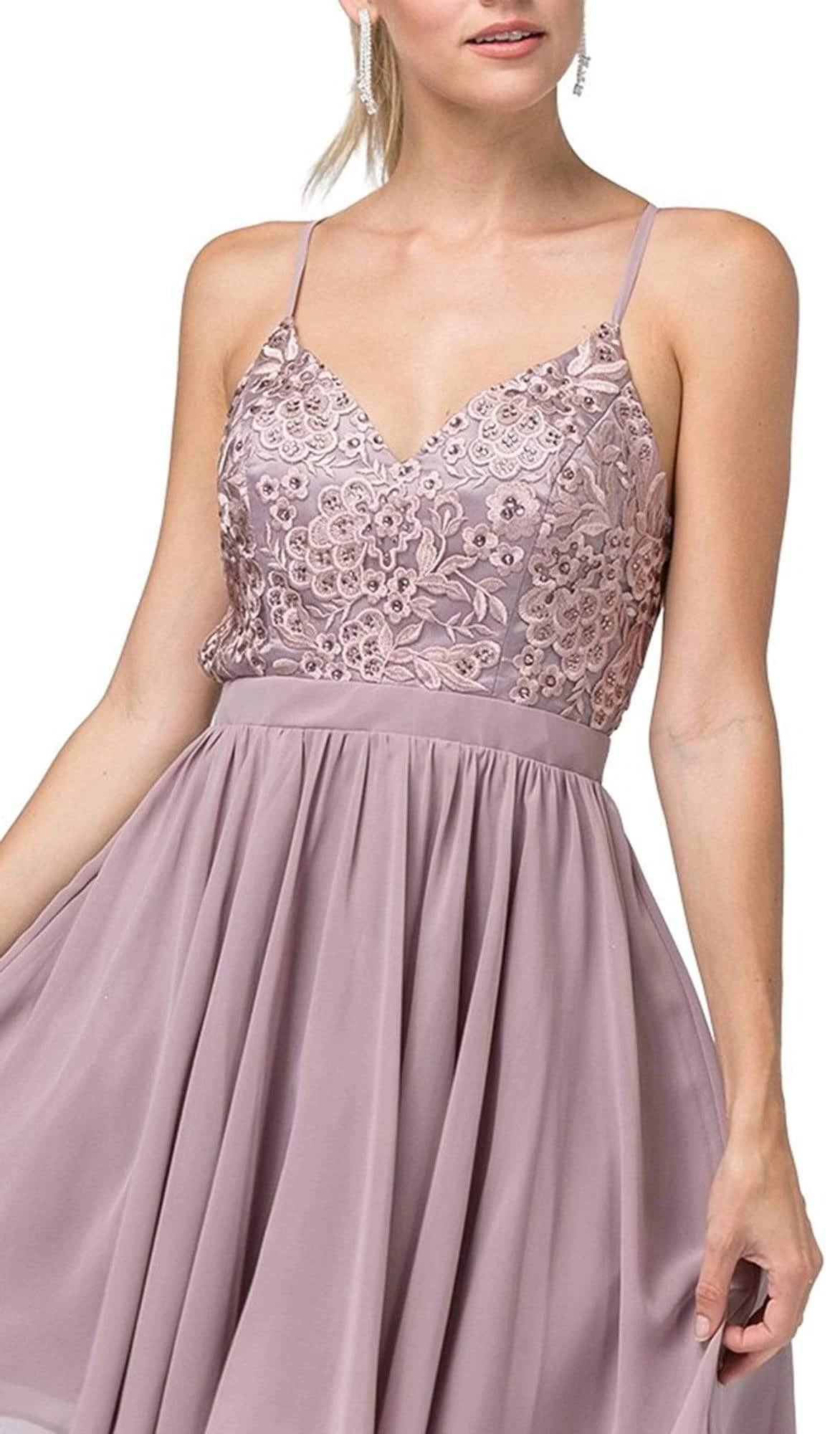 Get ready for everyone to stop and stare when you show up in this Dancing Queen 3089 look. Fashions a sleeveless, V-neckline with embroidered bodice supported with spaghetti straps. The fitted bodice flaunts an open back and has a zipper closure. The waist is wrapped in a band and flourishes a mid-thigh A-line skirt. This Dancing Queen dress is perfect on your next formal event!