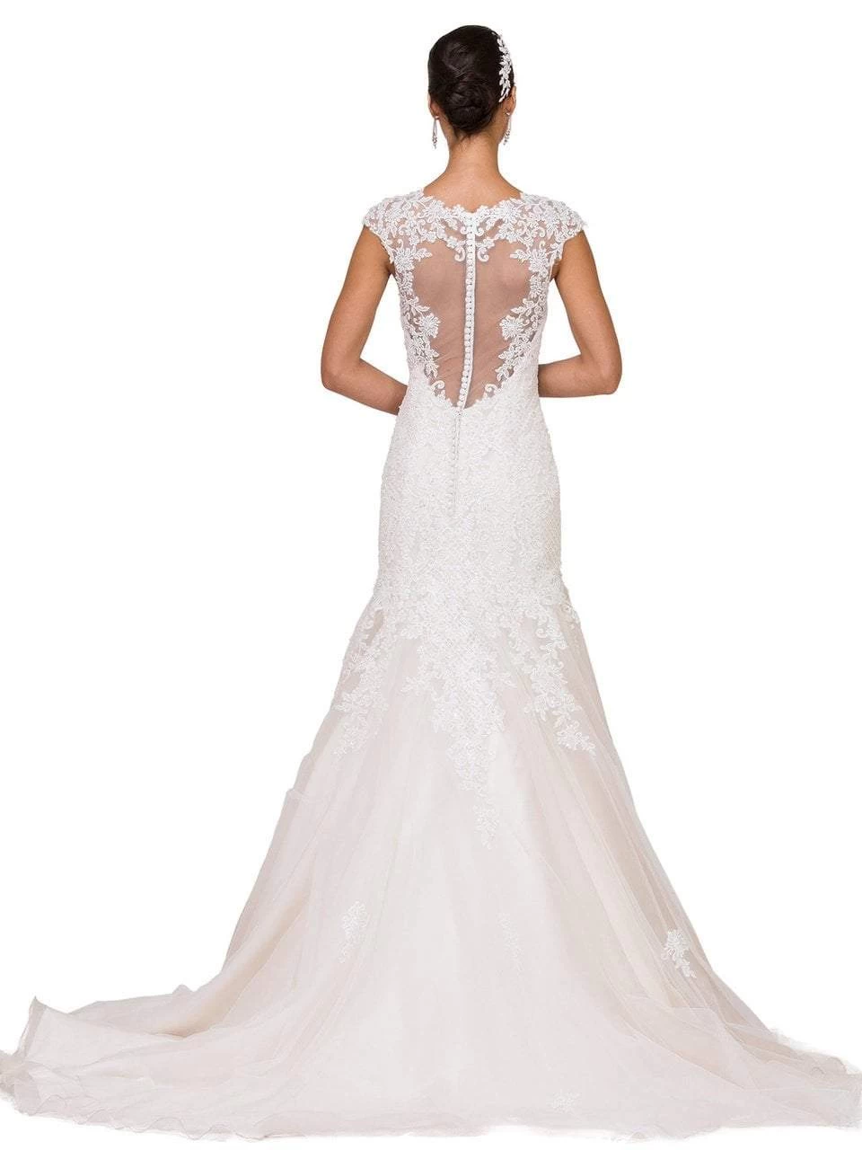 Refined and romantic in textured lace, Dancing Queen 0011 wedding dress offers classic appeal in a figure-flattering fit and flare silhouette. Elegant blend of textured lace over delicate sheer fabric, this gorgeous gown features a cap sleeved, fitted bodice with a sculpted scoop neckline. The back of the bodice is crafted with illusion accents and lace appliques, beautifully finished with a row of covered buttons that trail down at the center. This figure-flattering look is designed to fit snugly through the bodice and hips before flaring out into a frothy flared skirt with a court length train. This Dancing Queen wedding gown is perfect for the modern bride who wants a beautiful, memorable look for her big day.