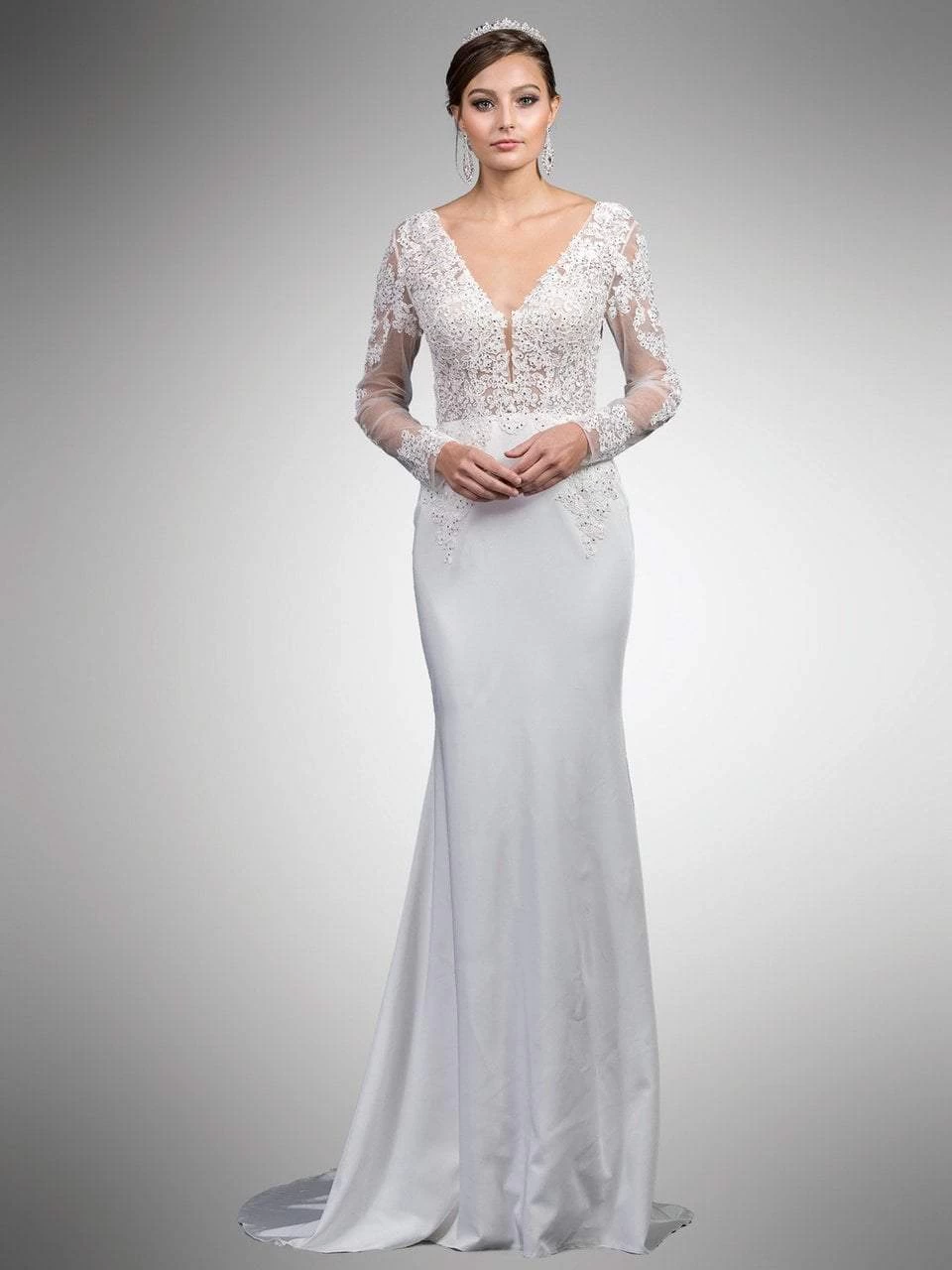 Commence a new chapter of your journey to forever in this fascinating Dancing Queen 0052 creation. Fashions a V-neckline with sheer long sleeves, the fitted bodice is adorned with flittering beaded lace. The fitted bodice is styled with a low V-back while the full length sheath skirt completes in a sweep train for added drama. Capture the glamour as you walk on this gorgeous Dancing Queen.