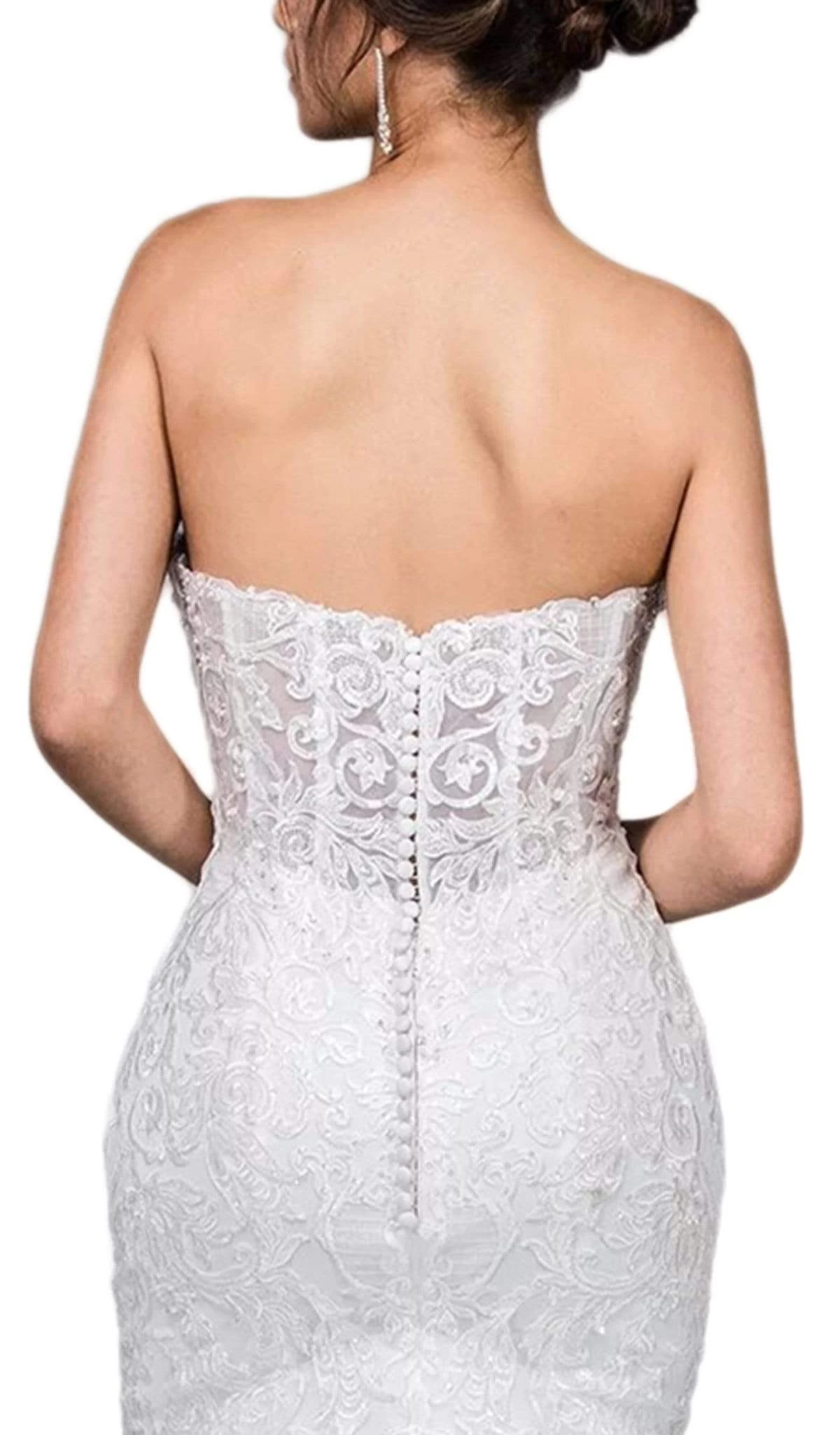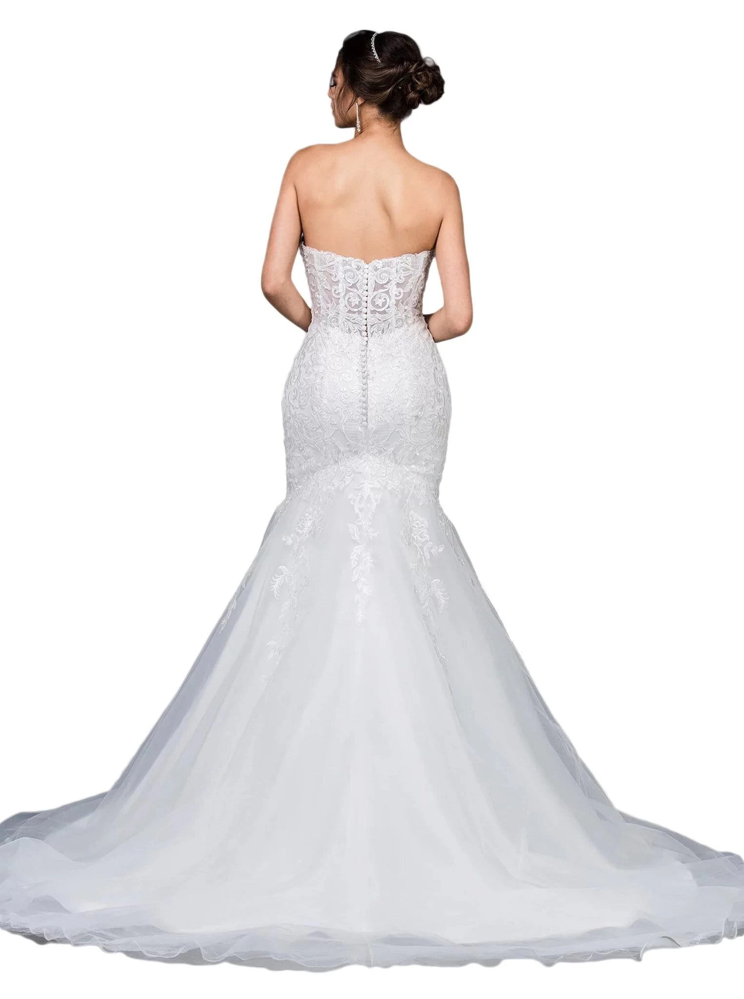 | Details: | Strapless, Plunging neckline, Fitted bodice, Mermaid skirt, Covered buttons, Sweep train |
