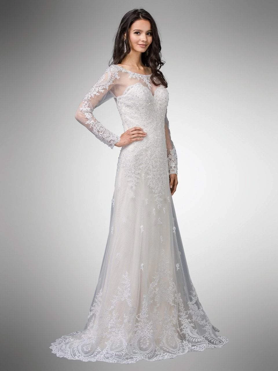 Feel dainty and feminine in this enchantingly designed gown by Dancing Queen 0009. Glams in an illusion bateau neckline with long sleeves, the sweetheart lined bodice is extravagantly adorned with glittering beaded lace. The back has a low scoop cut and features buttons that lines at the back. From the natural waist flares a full length A-line skirt with a sweep train finish. Create magical moments as you revel in this Dancing Queen ensemble.