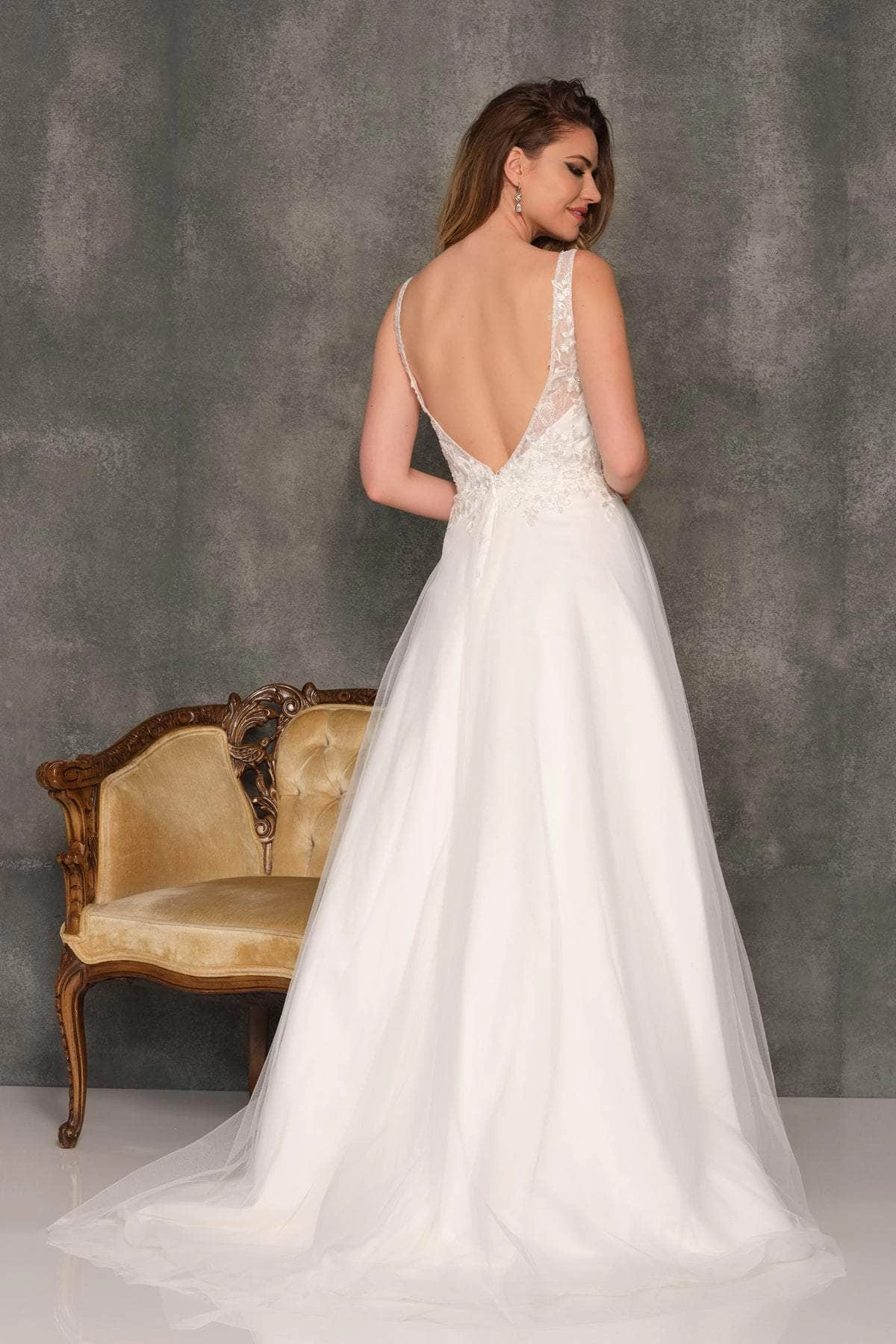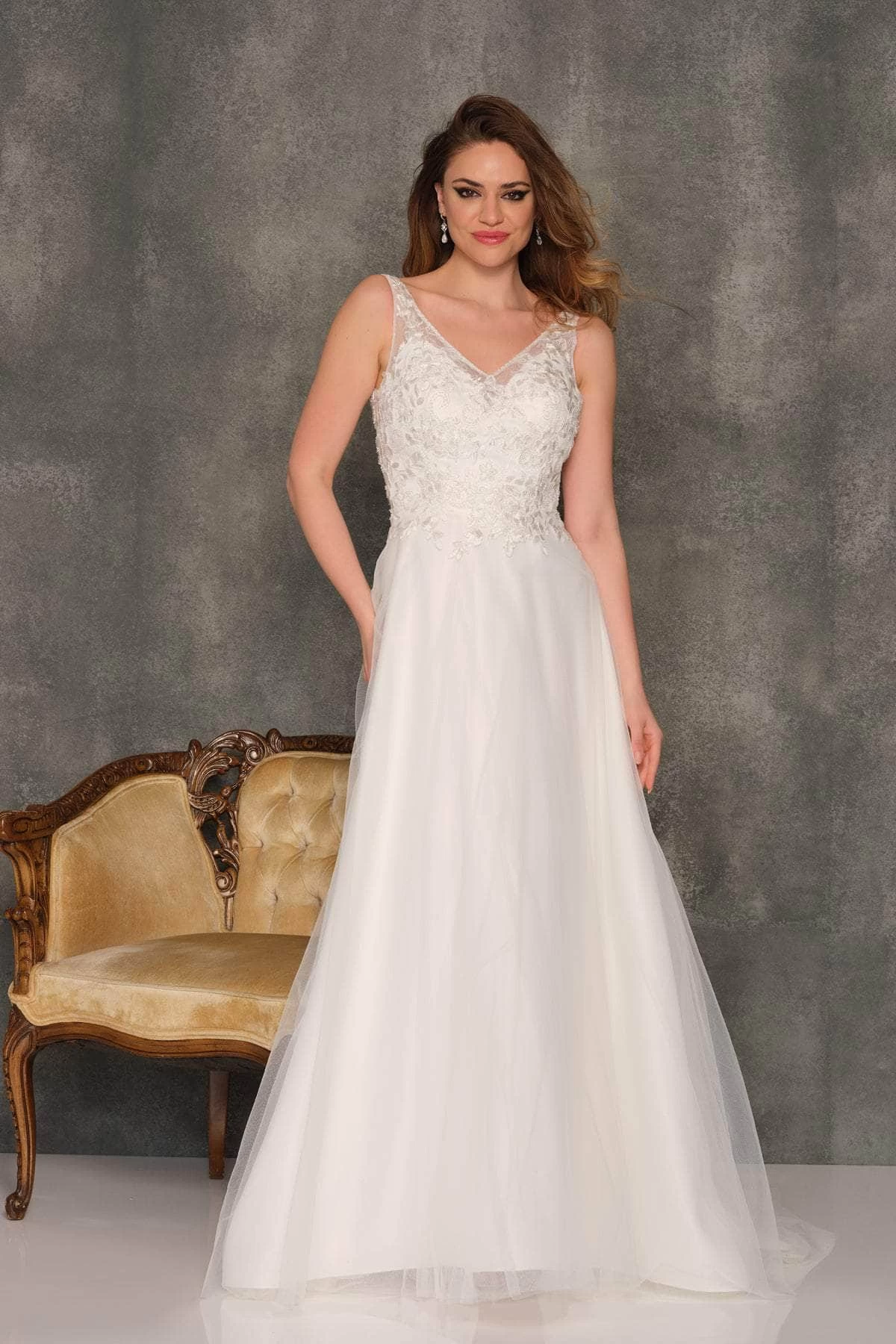 Tantalize everyone with the fascinating beauty and flair in this gorgeous Dave & Johnny 10465 creation. Ornamented with embroidered lace details with tonal beadwork, this stunning beauty crafts a v-neckline with sheer trims. Designed with a sheer low v-open back and a concealed zipper closure, the classic layered skirt forms an A-line silhouette ending in a sheer train. Go beyond beautiful while walking down the aisle at your wedding day in this Dave & Johnny masterpiece. Model is wearing the Ivory color.