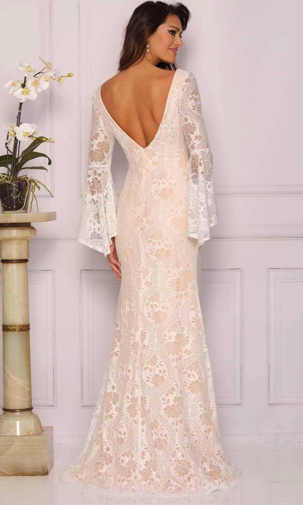 Radiate in pure elegance as you walk down the aisle in this wedding dress from Dave & Johnny A10486. Features a lavish lace bodice that grabs the spotlight, fashioned with embroidered lace, and featuring a V-neckline with mesh inset paired with long bell sleeves. The low open back is secured with a concealed zipper while the skirt glams in a sheath style giving you the comfort to move with its silhouette. Elegant and effervescent, this dazzling wedding ensemble from Dave & Johnny is a glamorous choice for your big day! Model is wearing the Ivory color.