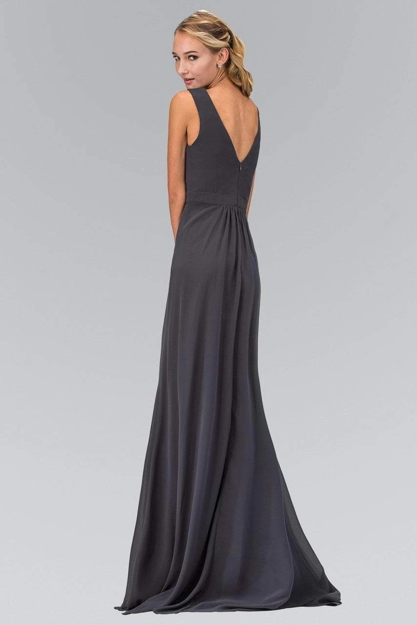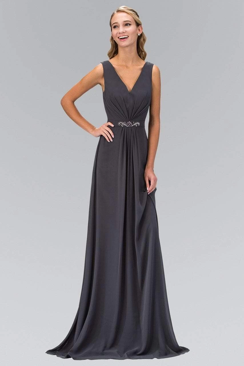 Get glamorous underneath the modern and classic detailing on the A-line silhouette of Elizabeth K GL1389. Features a sleeveless V-neck line with pleated details on the bust. The waist is cinched in a jeweled waistband and begins its A-line skirt. The back highlights a v-shaped cut. Look sophisticated and classy with this dress by Elizabeth K.