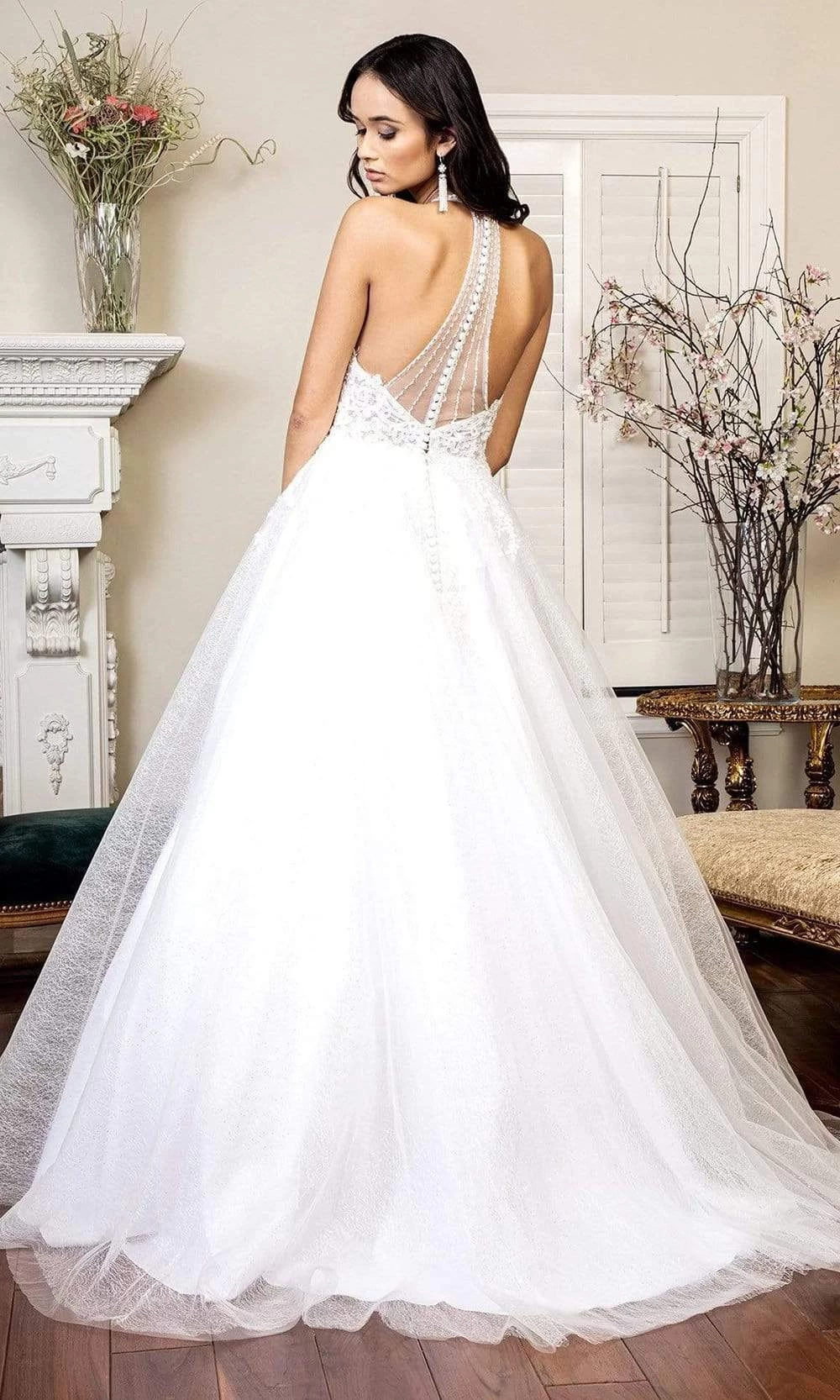 Look like a siren in a melodic gown from Elizabeth K GL1948. Be the most beautiful bride when you wear this A-line wedding gown that features V neckline and a revealing back style. Bodice uses lace fabric and the skirt in full length is designed with sort of embellishments. Back uses back buttons. This Elizabeth K wedding dress is a thoroughly modern choice for a bride who values a personalized, high-fashion wedding over a purely traditional one, the dress’s details styling you radiant at the center of attention on your wedding day.