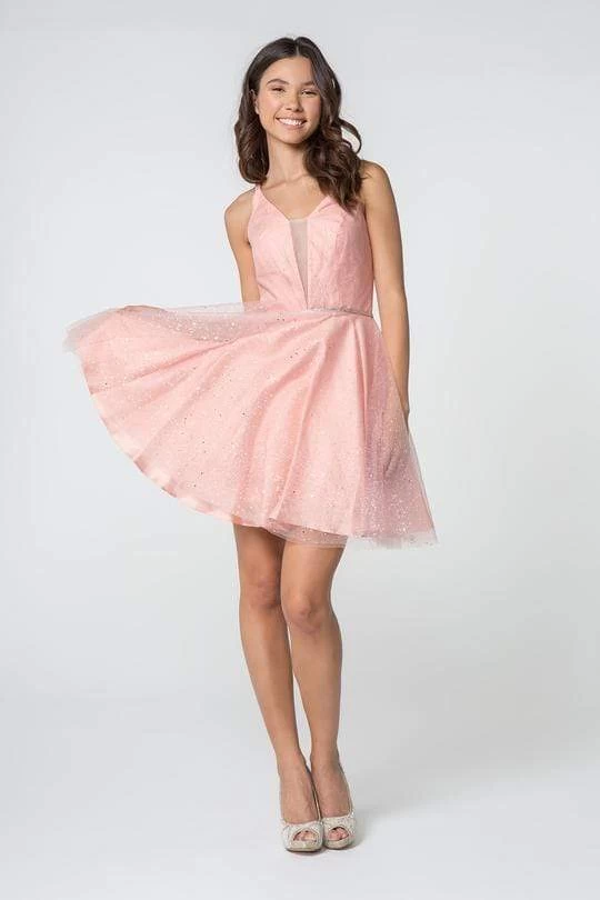 Leave them awed at your luminous presence while donning this Elizabeth K GS2865 creation. The bodice is defined with pleats as a sheer glittering overlay drapes its entirety. A scoop open design defines the metallic clad waist. The A-line skirt twinkles as it cascades into a short hemline. Look precious as a rare gem in this Elizabeth K masterpiece. Model is wearing the Blush color.
