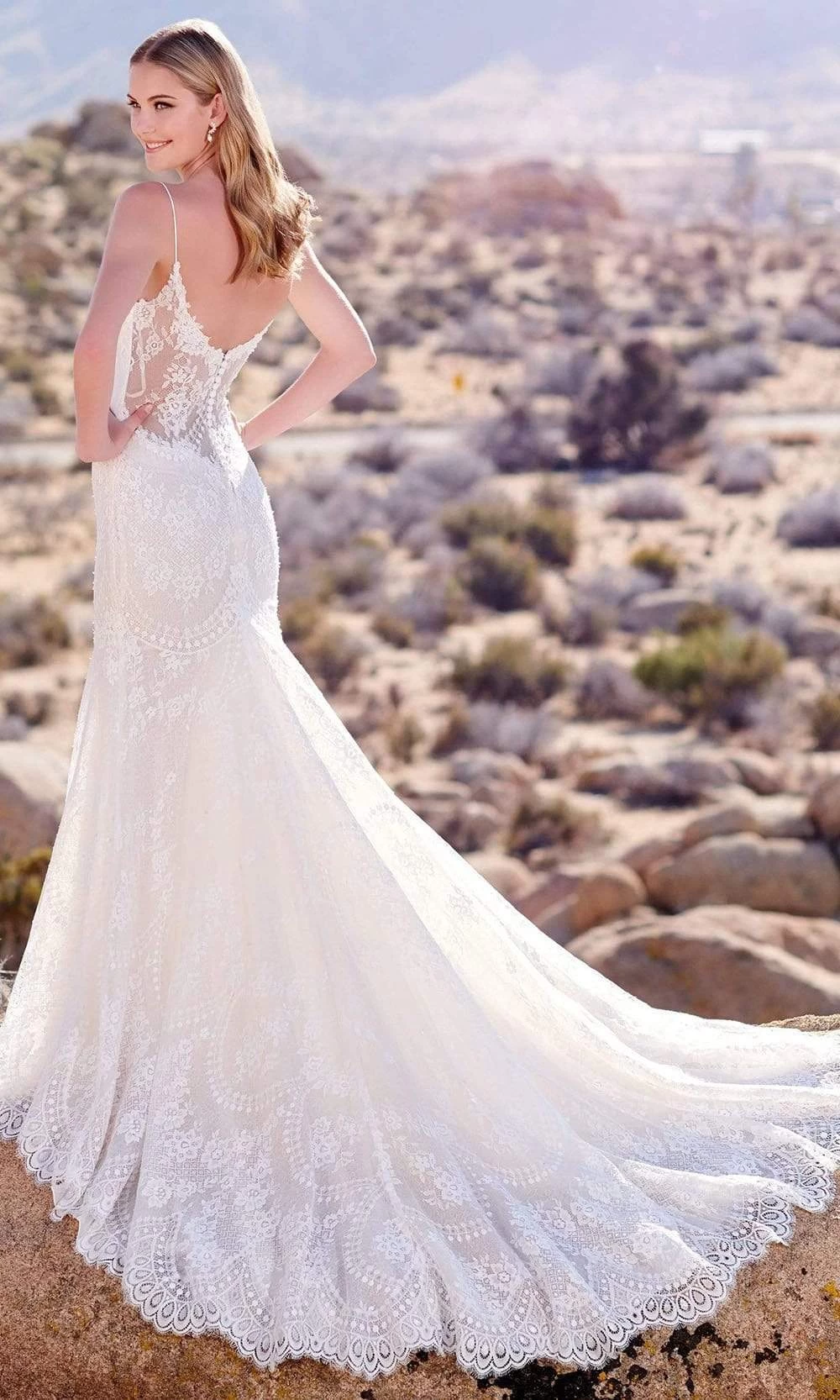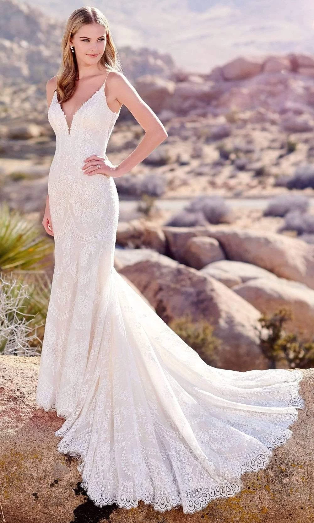This Enchanting by Mon Cheri 220106 allover lace wedding gown with a chic sheer back creates a bridal look that is a total modish and classy. Fashions a sleeveless bodice with a deep V neckline with sheer inset, spaghetti straps and a scoop shaped sheer back with fabric covered button accent and hidden center zipper. The skirt streams to touch the floor with its sheath silhouette before draping into a scalloped hem court train. Be every bit as perfect as a blushing bride should be in this wedding dress from Enchanting by Mon Cheri. Model is wearing the Ivory/Light Champagne color.