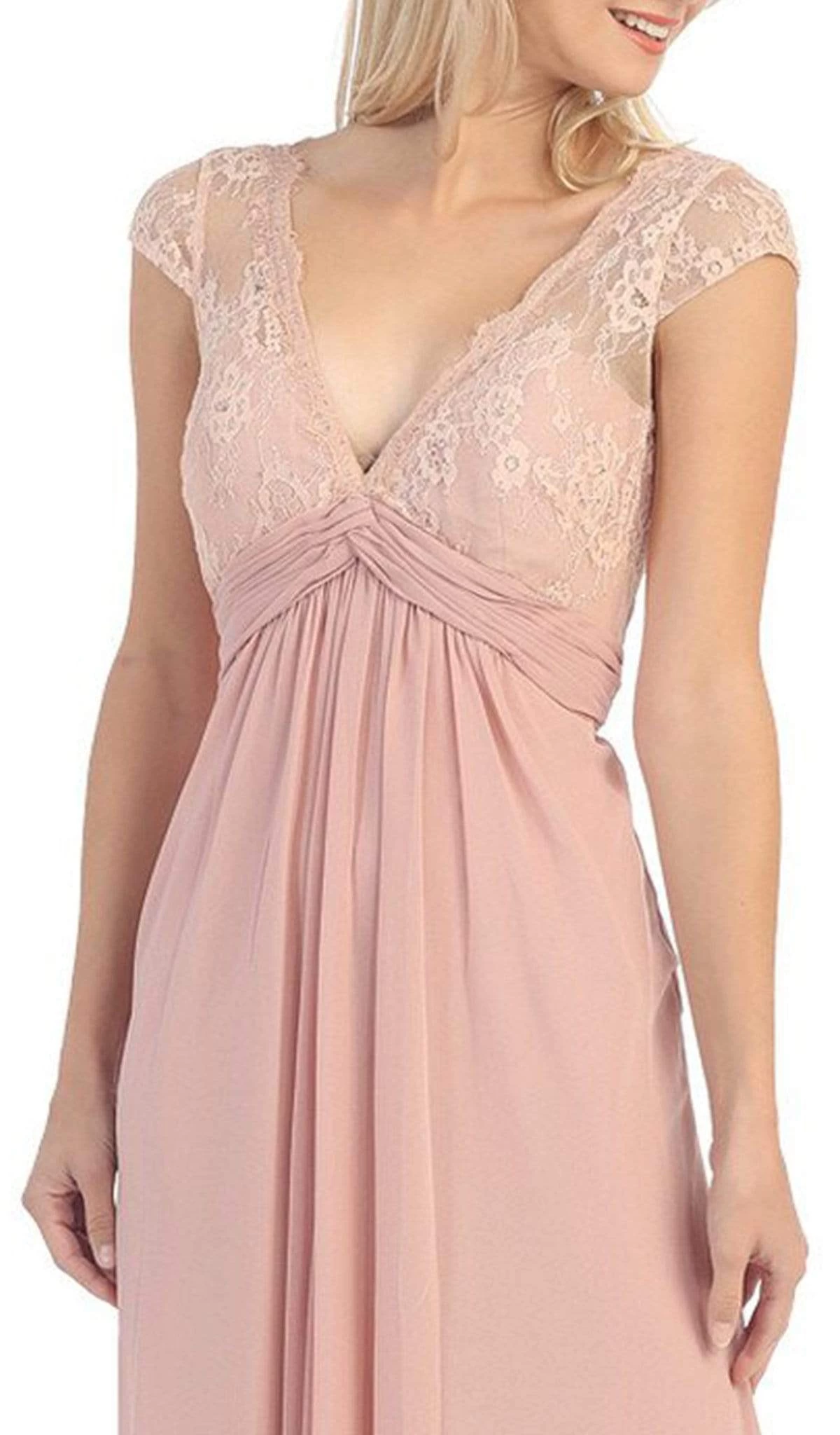 Standout among the fabulous crowd as all eyes focus on you in this glamorous Eureka Fashion 2383 creation. This sophisticated dress showcases a V-neckline with cap sleeves. The dress is made of lace fabric on its bust and is accented with ruching at the empire waist. The chiffon skirt opens in an A-line silhouette and runs at full-length hem. Enhance your visual appeal in this luxurious dress from Eureka Fashion.