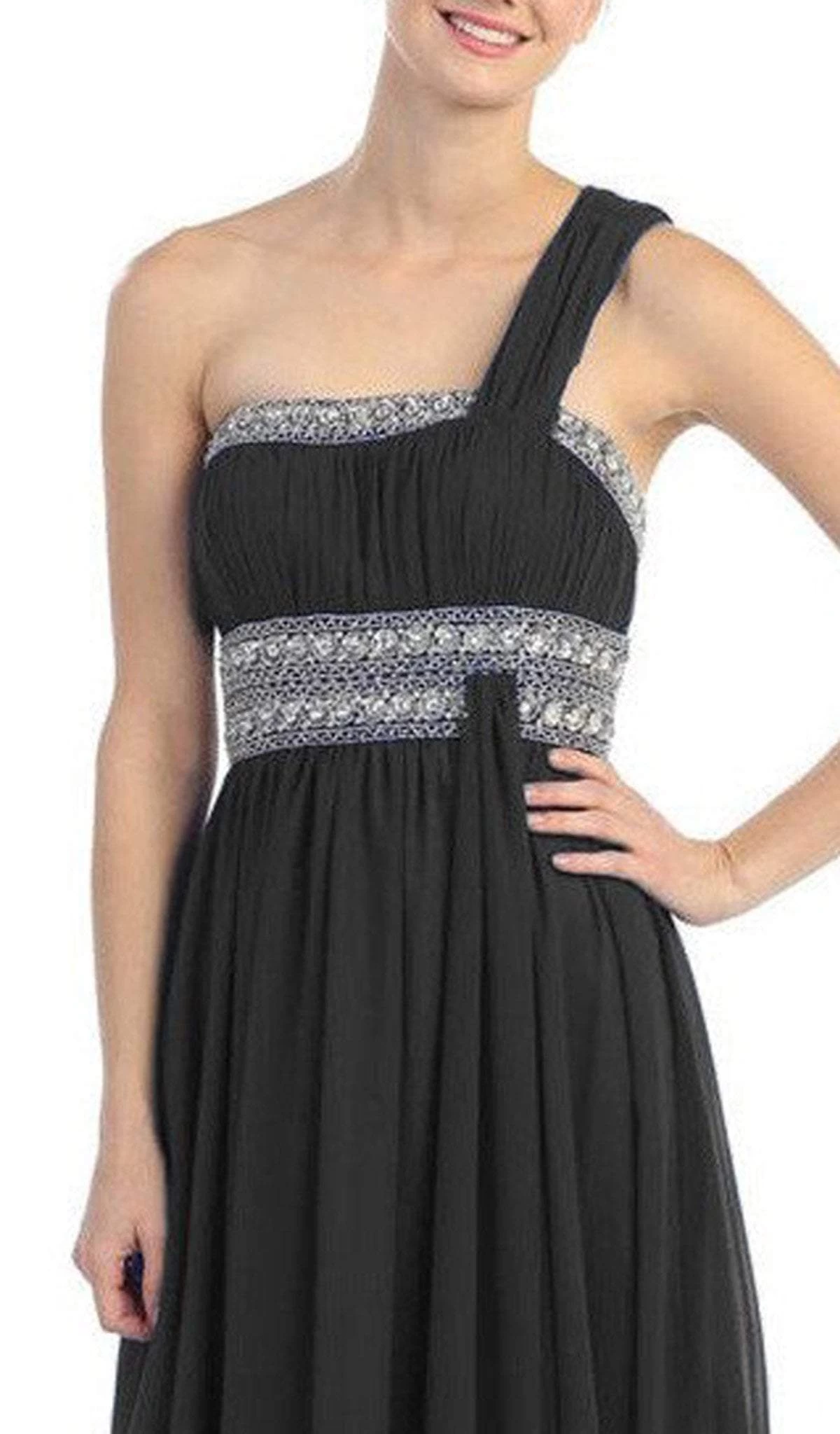 | Details: | Chiffon, Bead-Trimmed Neckline, Ruched Bust, Double Banded Waist, Streaming Panel, Full Length Hem |