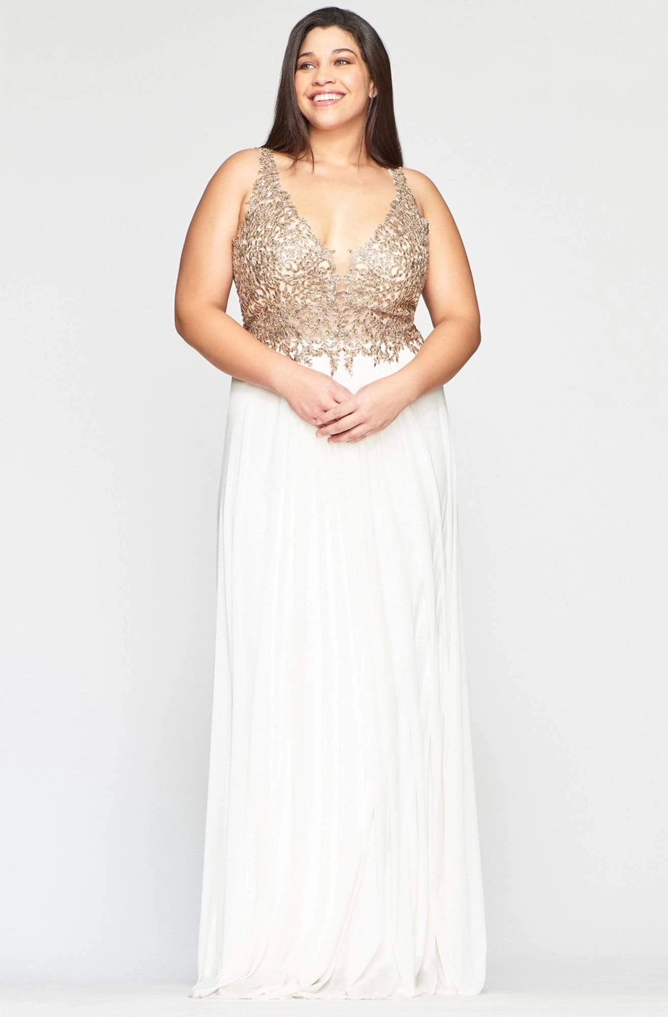 Dress to impress on your next formal event in this simple but captivating Faviana style 9428. This mesh dress features beautiful lace applique on the top, and a V-neck with an illusion insert to show just the right amount of skin. This sleeveless, plus size dress has a sheer waist and back and finishes in a full length hem. This Faviana creation definitely parades the elegant and classy style. Model is wearing Navy and Ivory/Rose Gold color.