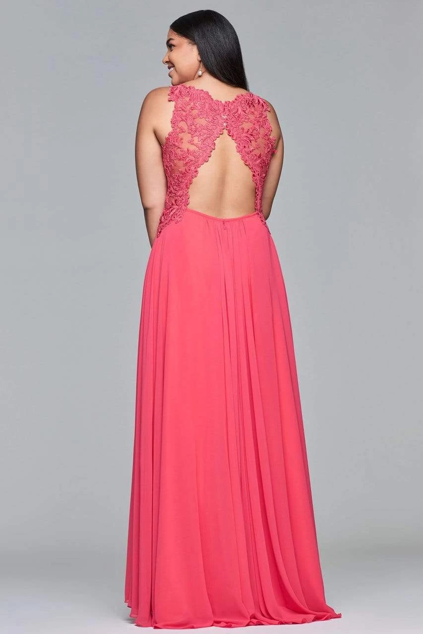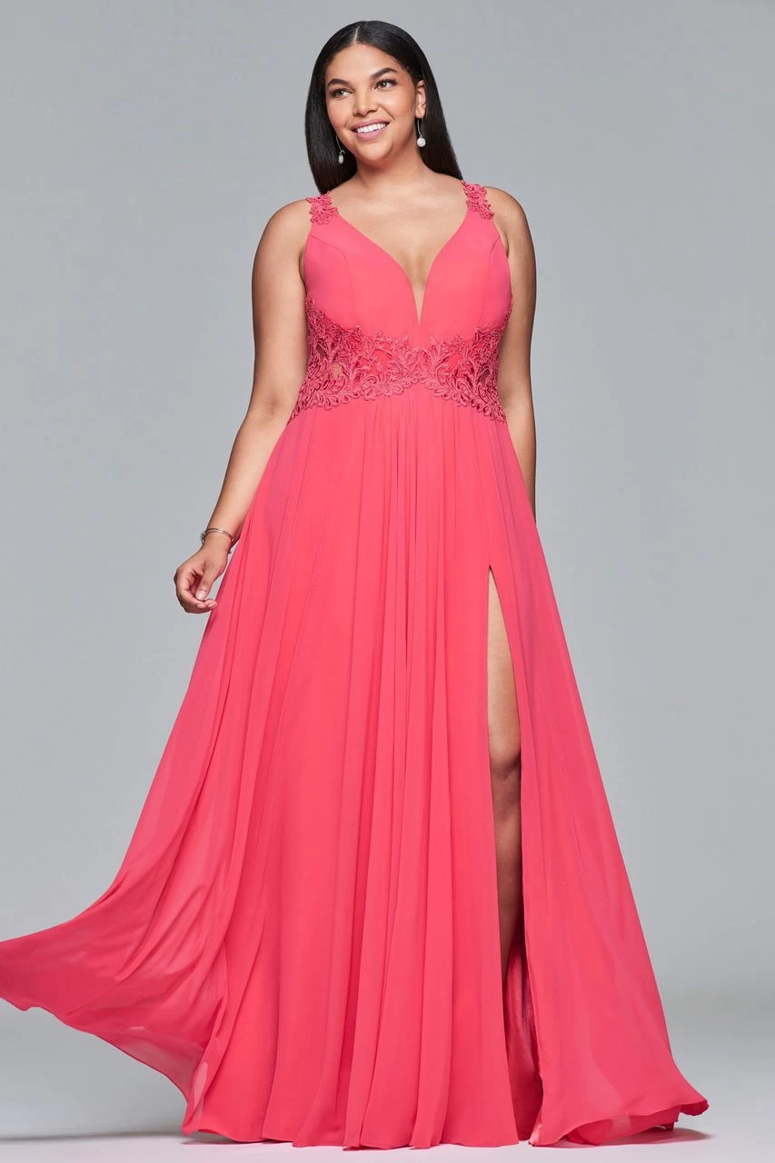Show off your sweet side in this dress by Faviana 9433. This flowy chiffon dress features lace applique and a keyhole design at the back. This creation has a V-neckline that emphasized by the lace details and paired with an elegant A-line skirt that has a high slit design. This Faviana creation is truly remarkable! This model is wearing Guava color.