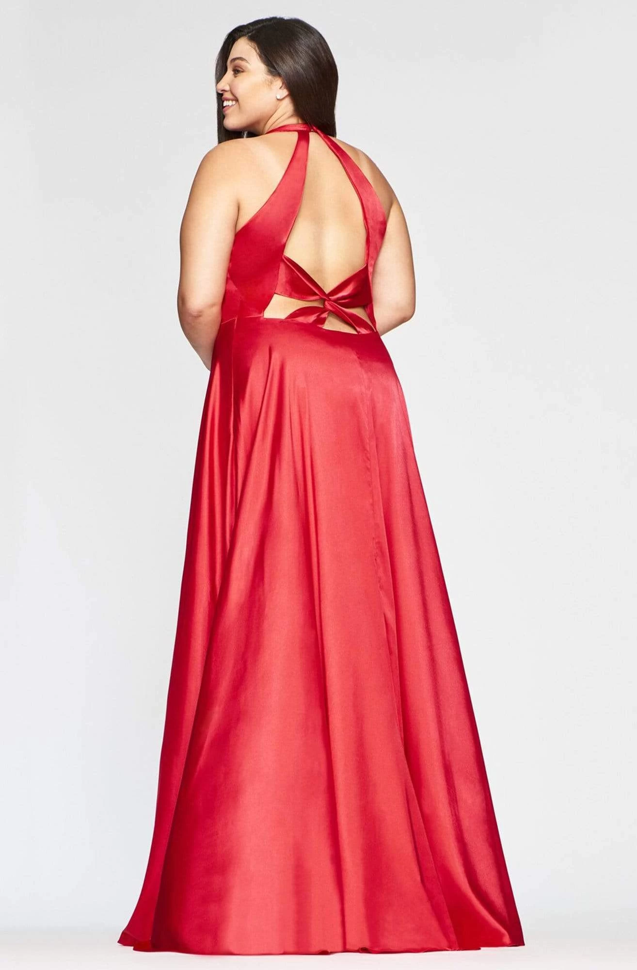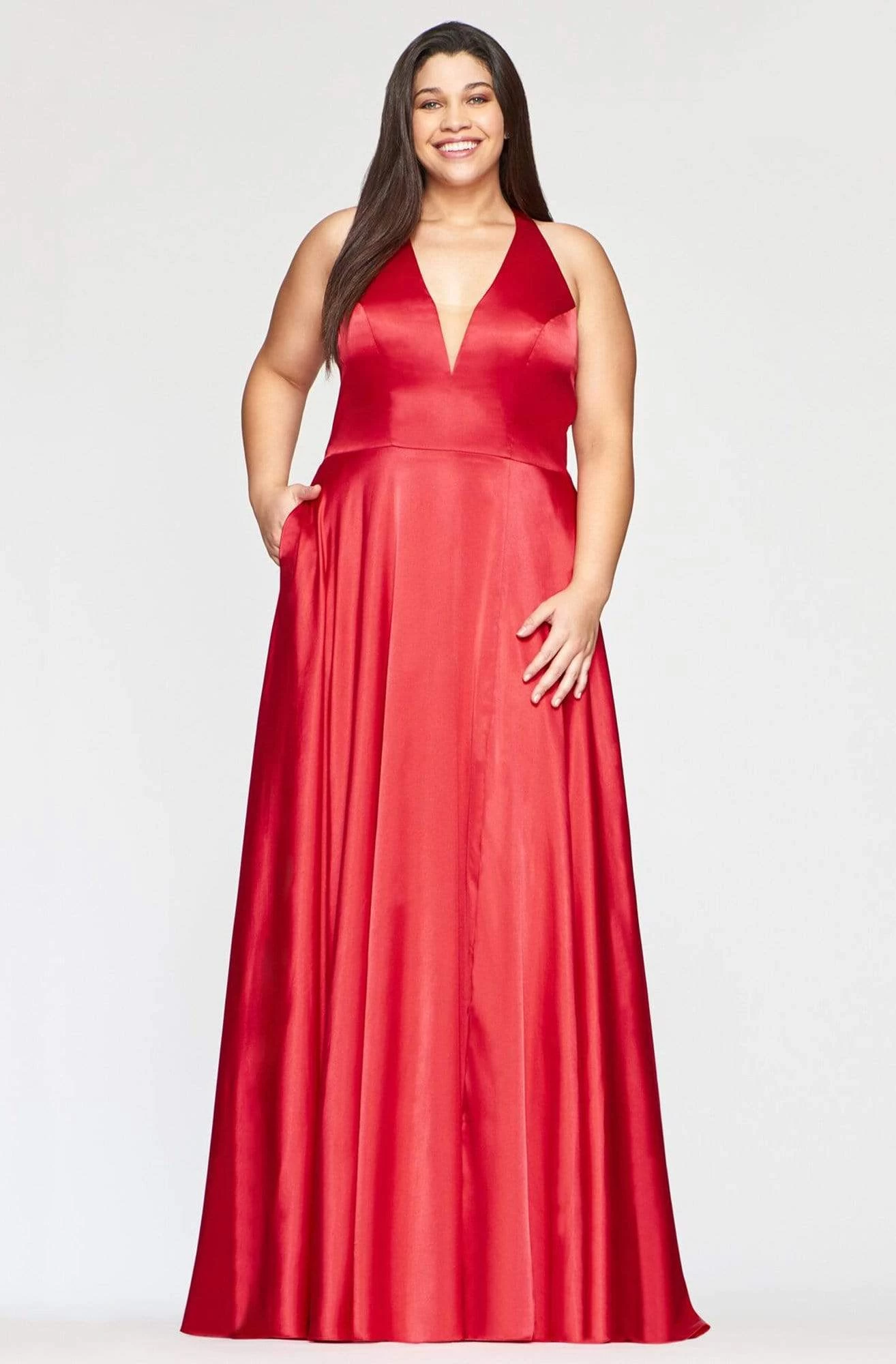 Step out in style wearing this stunning dress by Faviana 9495. This charmeuse dress shows off a sleeveless, deep halter V-neckline with sheer inset and criss cross straps. The dress has a fitted bodice and full length A-line skirt styled with pockets. Exhibit exceptional style in this superb evening gown by Faviana. Model is wearing Red color.