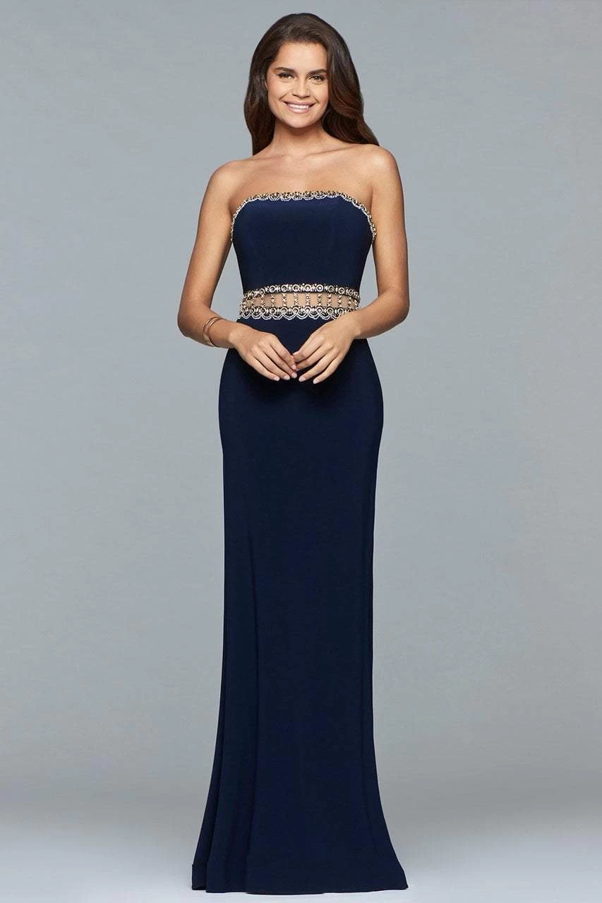 Stand out in Faviana S10027. This jersey dress stands out due to the gold detailing along the top and waist that ist the right amount of skin. The dress has a strapless, straight across neckline with a full length sheath skirt. Wear this Faviana dress and You are sure to turn heads at prom, or an evening event! Model is wearing Navy color.