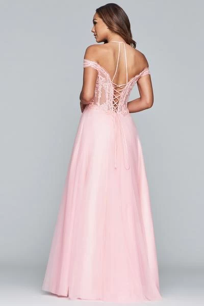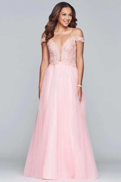 Flaunt your curves and charm everyones attention with this gown from Faviana S10229. The gown features a plunging V-neckline with cold shoulder details and off-shoulder sleeves. The fitted bodice is adorned with beading and is styled with a lace up back for an adjustable fit. From the natural waist flourishes a tulle ballgown skirt. This Faviana gown is a showstopping look, perfect for those who love understated luxury. Model is wearing Rose Pink color.