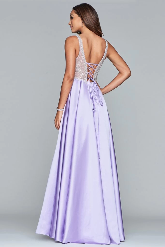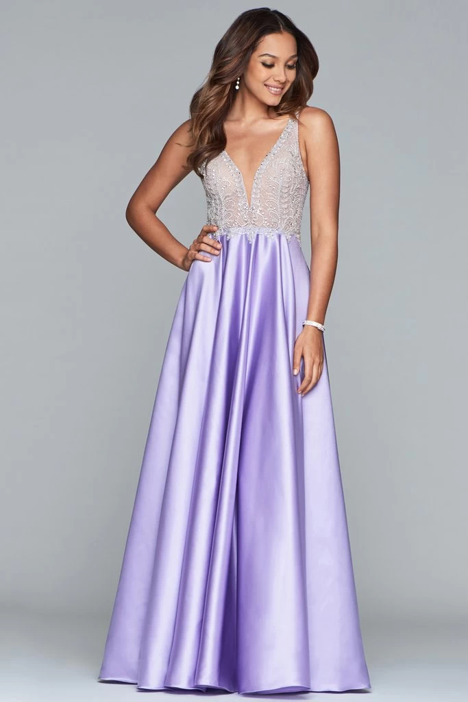 Get ready for everyone to stop and stare when you show up in this unique gown from Faviana S10291. Fashions a sleeveless, deep V-neckline with sheer fitted bodice embellished with beading. The gown has a lace up closure for an adjustable fit and flourishes a satin ballgown skirt. This enchanting Favianasure to make you the center of everyone’s attention. Model is wearing Lilac color.
