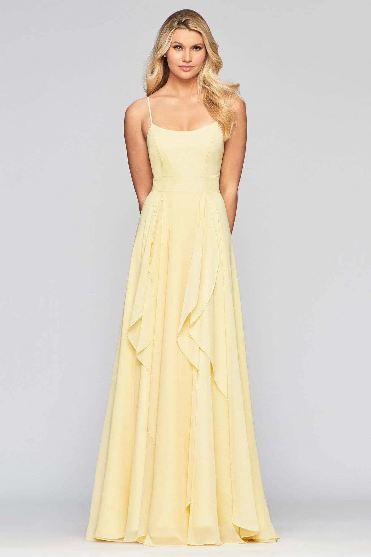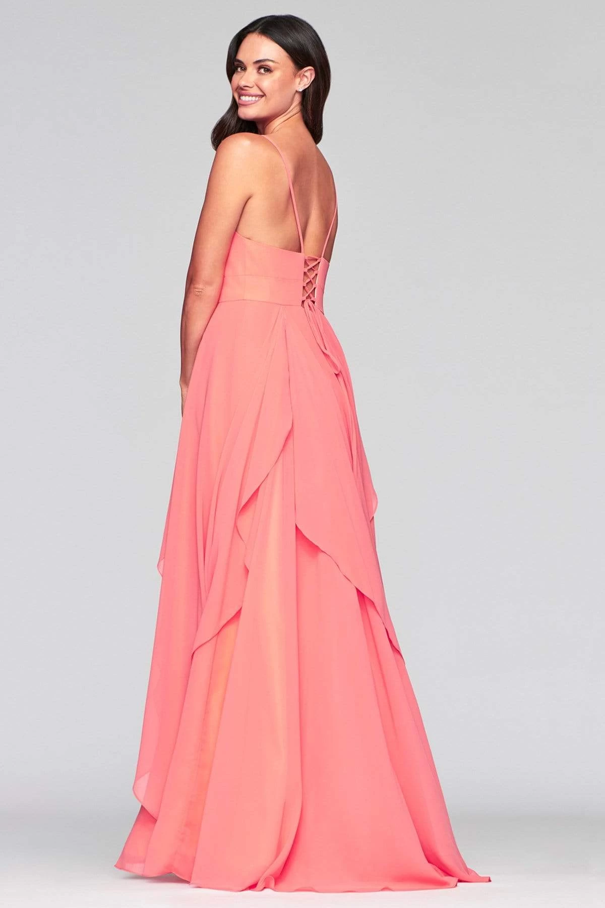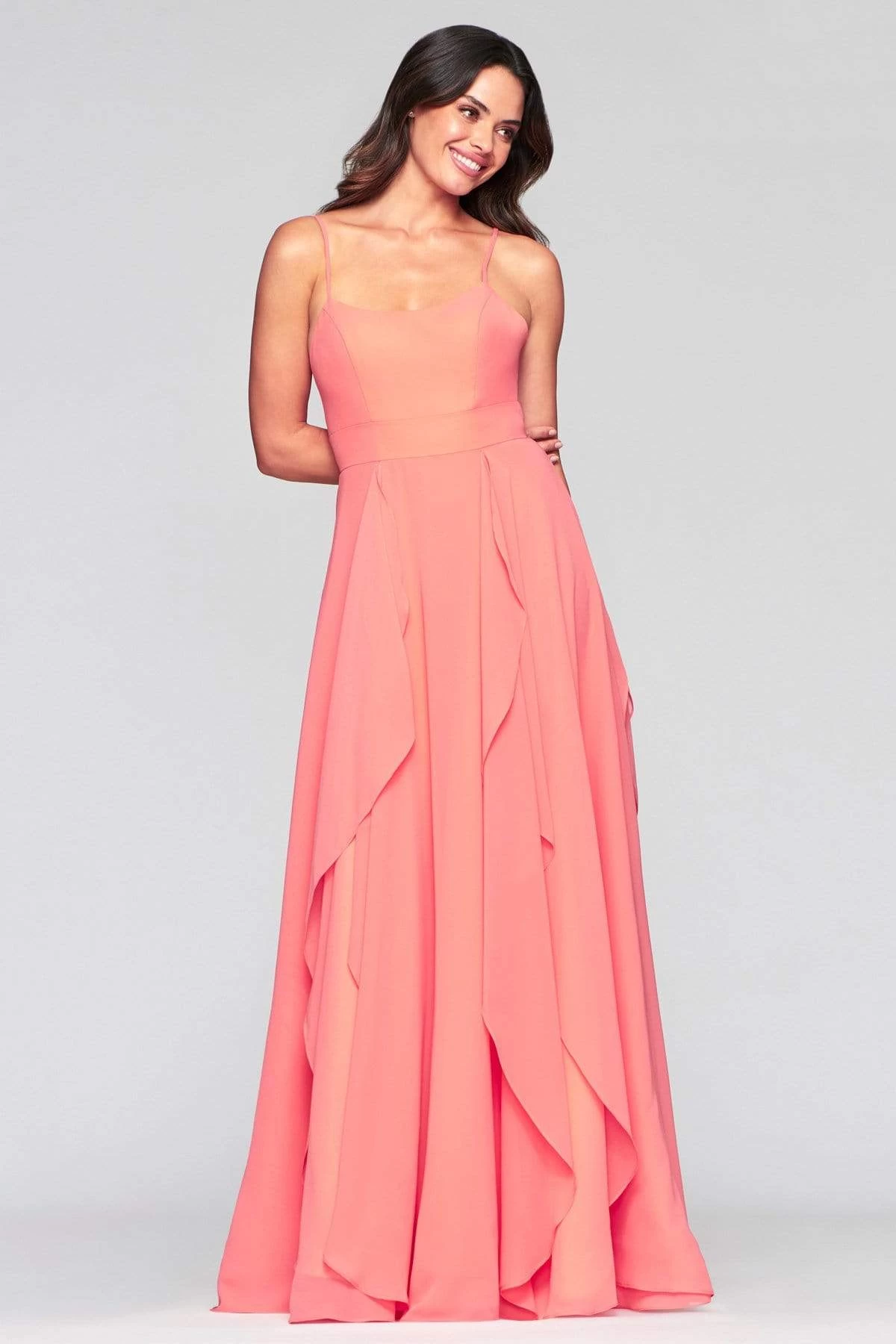 Be the loveliest of them all wearing this fashionable dress by Faviana S10434. Made in flowy chiffon fabric, this dress parades a princess seamed bodice with a scoop neckline and set-in wide empire band. Spaghetti straps lend support to the bodice and continue to the mid-open laced up back. Ruffle accents design the a-line skirt as it smoothly falls to a full-length hemline, completed with a sweep train. Be ready to capture the spirit of that romantic evening in this Faviana creation.