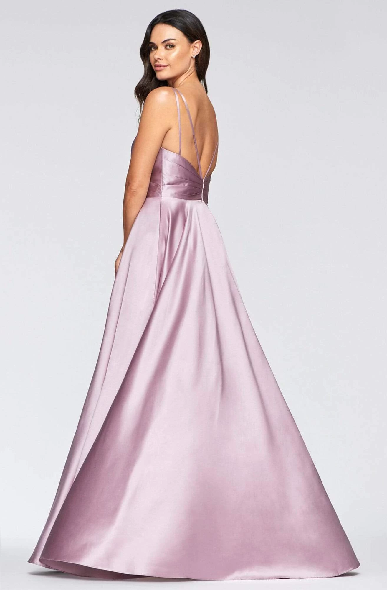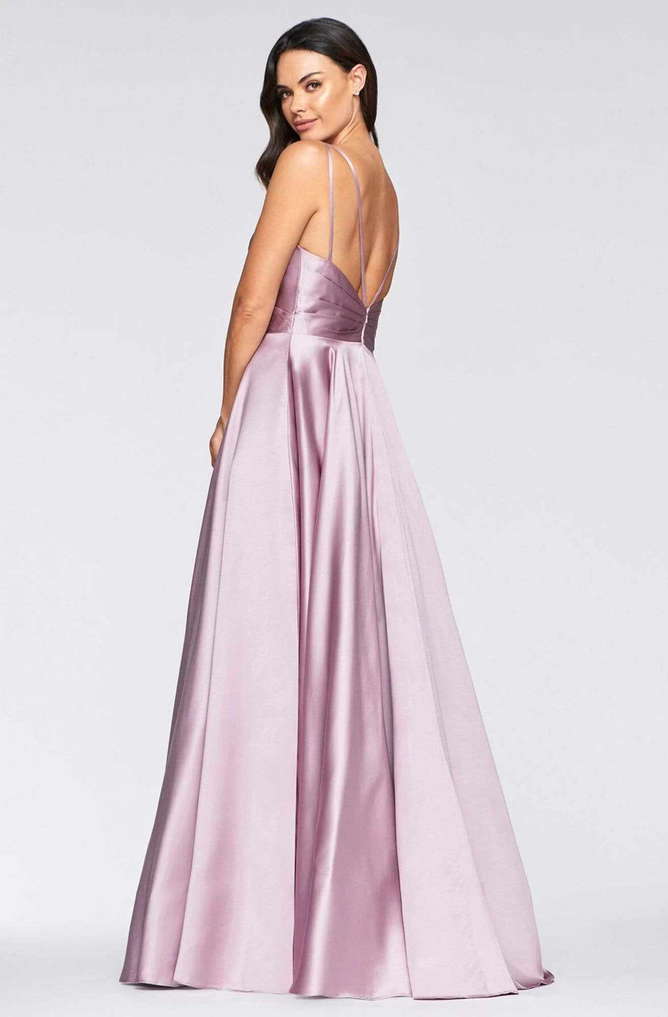 Infuse your special event with stellar style in this design by Faviana S10473. This satin dress captivates in a sleeveless, deep v-neckline with straps and a pleated bodice. It has an invisible zipper with hook and eye closure on its low open back. From the fitted waist fashions a full length A-line skirt that leads into a sweeping train. Make your night one to remember in Faviana. Model is wearing Deep Mauve color.