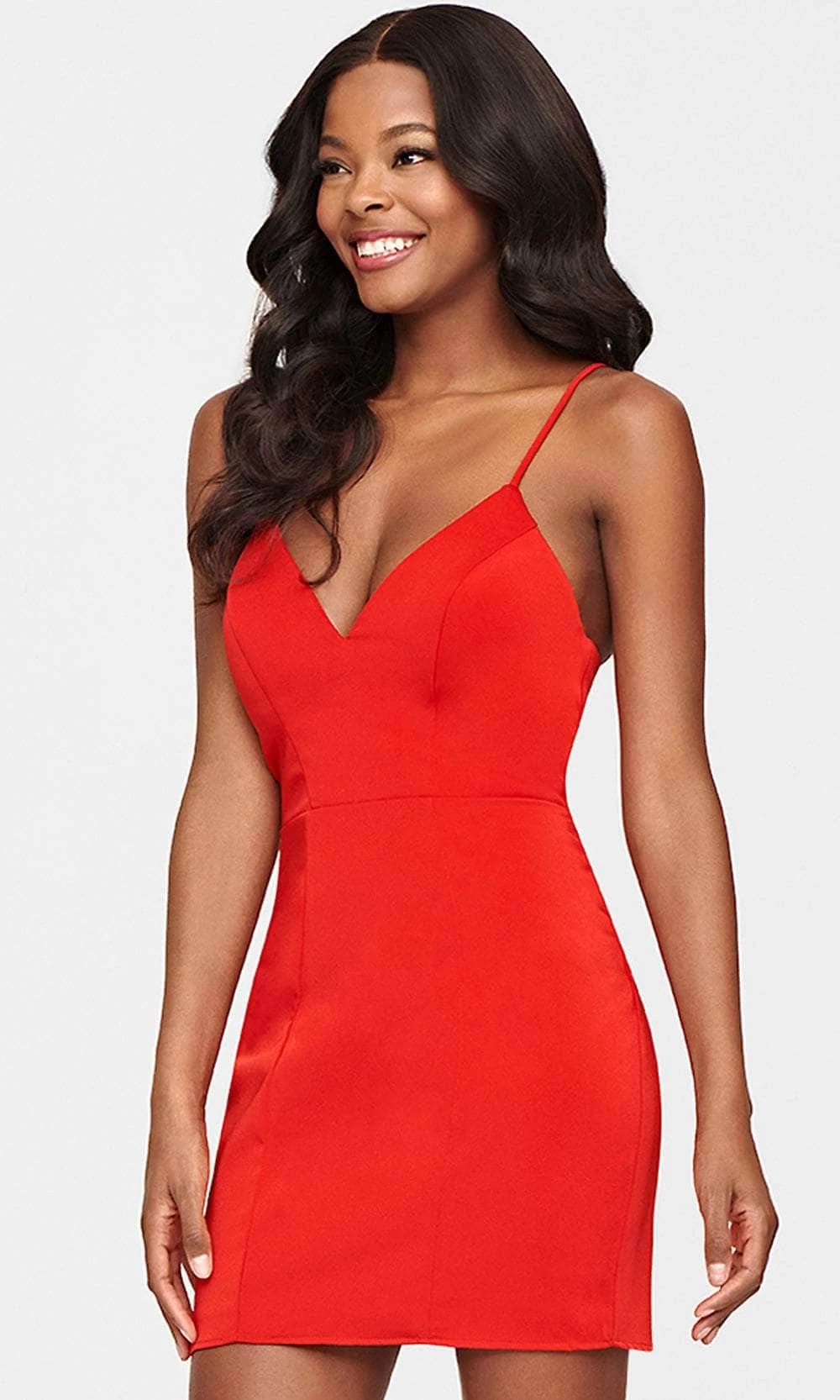 Classy and elegant, this cocktail dress from Faviana S10719 is a definite showstopper at any event. Beautifully contoured with tailoring seams, this ensemble features a sleeveless bodice with a deep V-neckline and spaghetti straps. The back reveals a glimpse of skin and has a lace-up tie for an adjustable fit. The sheath skirt embraces the female form down to a short hemline. Orchestrate your moment to stand out in this Faviana masterpiece. Model is wearing the Red color.