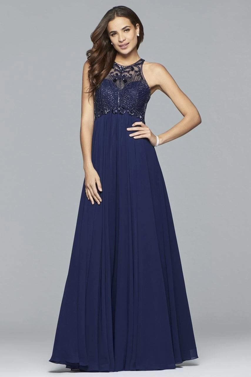 Faviana style S7989 is sophisticated and sleek. It is a modern halter neckline and a flowy skirt. This chiffon dress is available in charcoal, dusty pink, and peri. Pair with a simple cuff and teardrop earrings to compliment the beaded bodice. This style makes a great prom or homecoming dress or a dazzling bridesmaid dress.