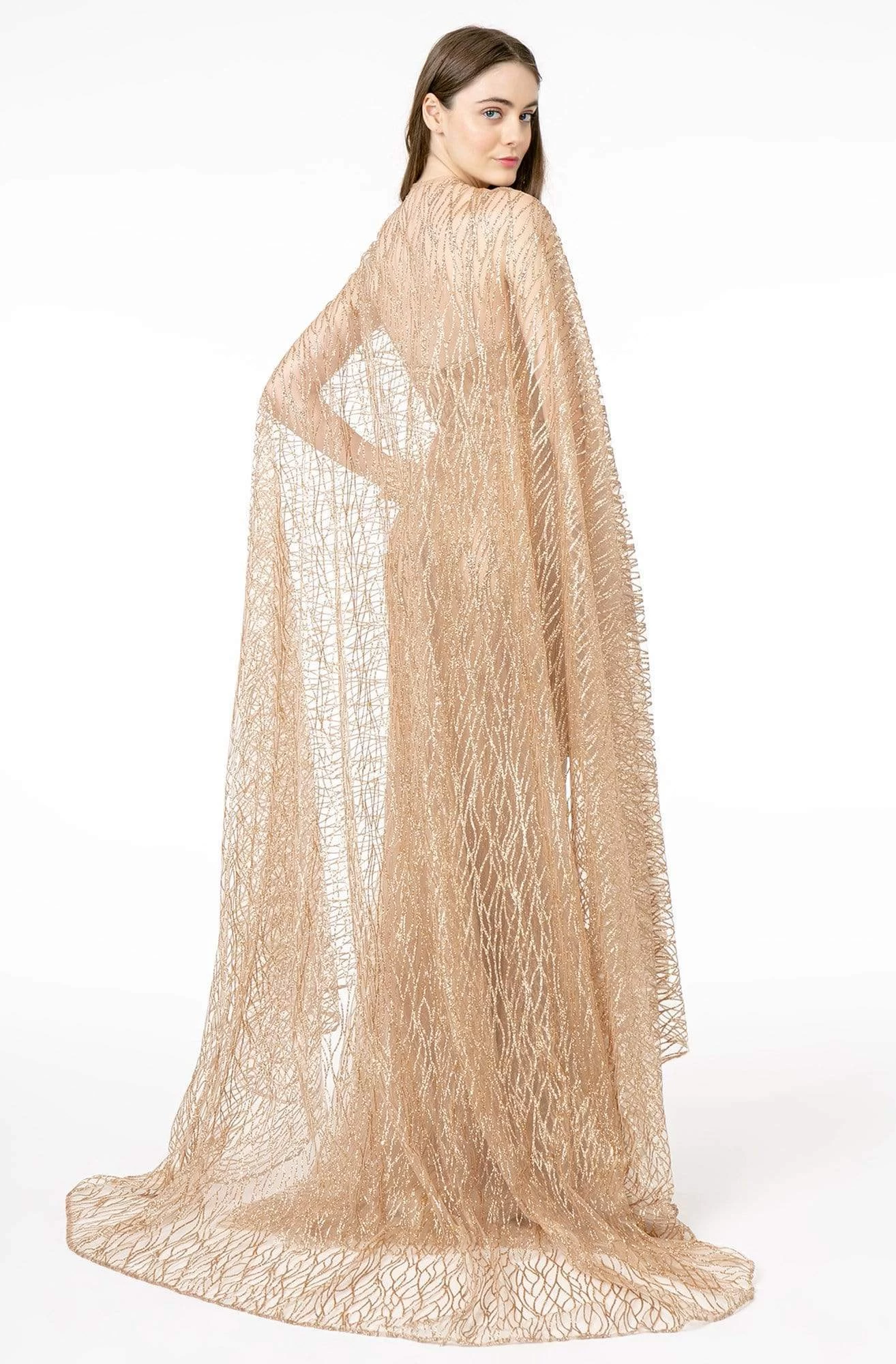| Details: | Sheer Floor Length Cape, Jewel and Glitter Embellishments, Fitted, Mid-Open Back, Back Zipper Closure, Sweep Train |