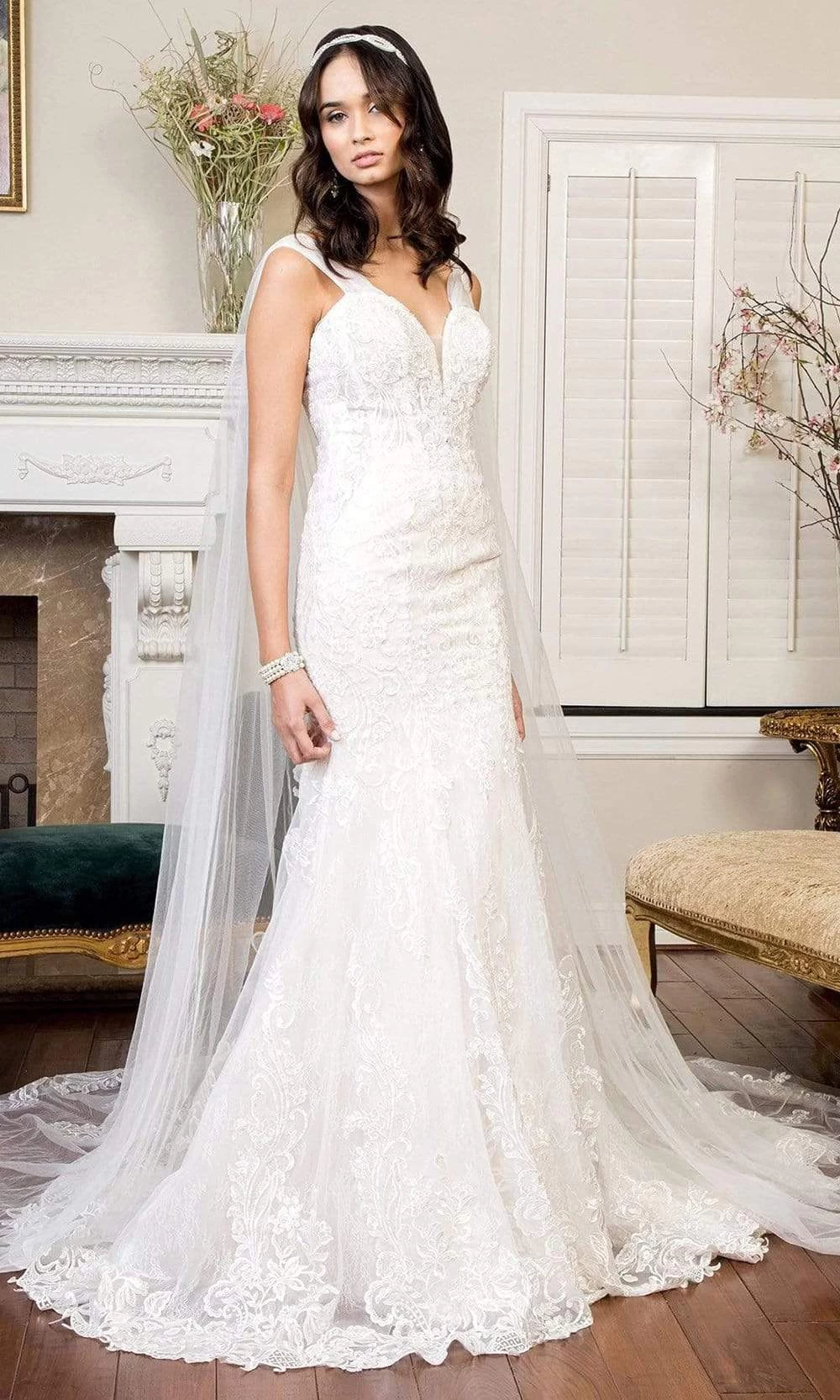 Showcase your stunning side with this GLS by Gloria GL1935 wedding dress. The whole ensemble is beautifully embroidered as the fitted bodice showcases a plunging V neckline with sheer inset and mid-open lace up back. The skirt reveals a mermaid silhouette and finishes with a chapel train. Fall in love when you slip on this GLS by Gloria dress.