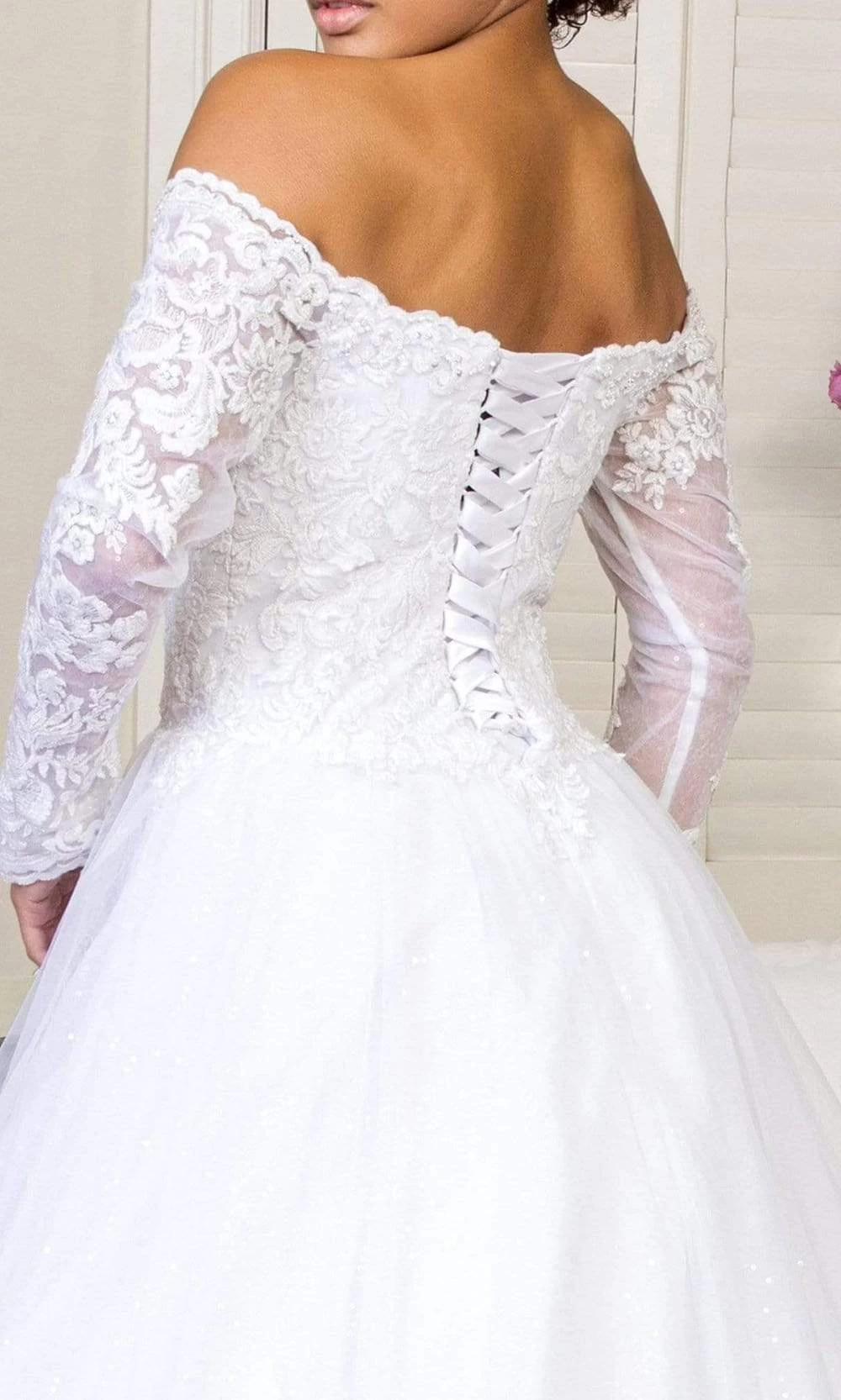 Have all eyes on you as you show up with this GLS by Gloria GL1937 wedding dress. The fitted bodice is beautifully embroidered, crowned with an off shoulder neckline, sheer long sleeves and mid-open lace up back. Soft pleats highlight the a-line skirt and finishes with a chapel train. This wedding gown from GLS by Gloria is perfect for photos.