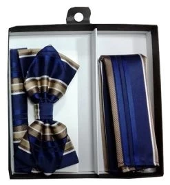 Blue/Brown Striped Bow Tie With Pocket Square (Pointed Tip)