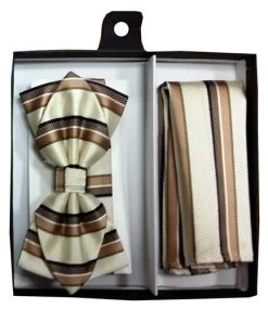 Ivory/Brown Striped Bow Tie With Pocket Square (Pointed Tip)