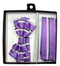 Lavender Striped Bow Tie With Pocket Square (Pointed Tip)
