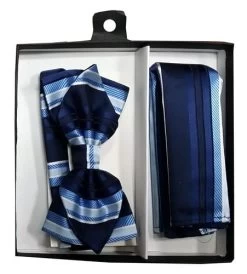 Navy Blue Striped Bow Tie With Pocket Square (Pointed Tip)