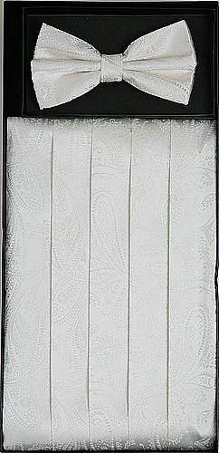 Add a timeless touch to your tuxedo or uniform with this ivory paisley cummerbund and pre-tied bow tie set. This ivory paisley cummerbund will accentuate your tuxedo and is great for any formal event.